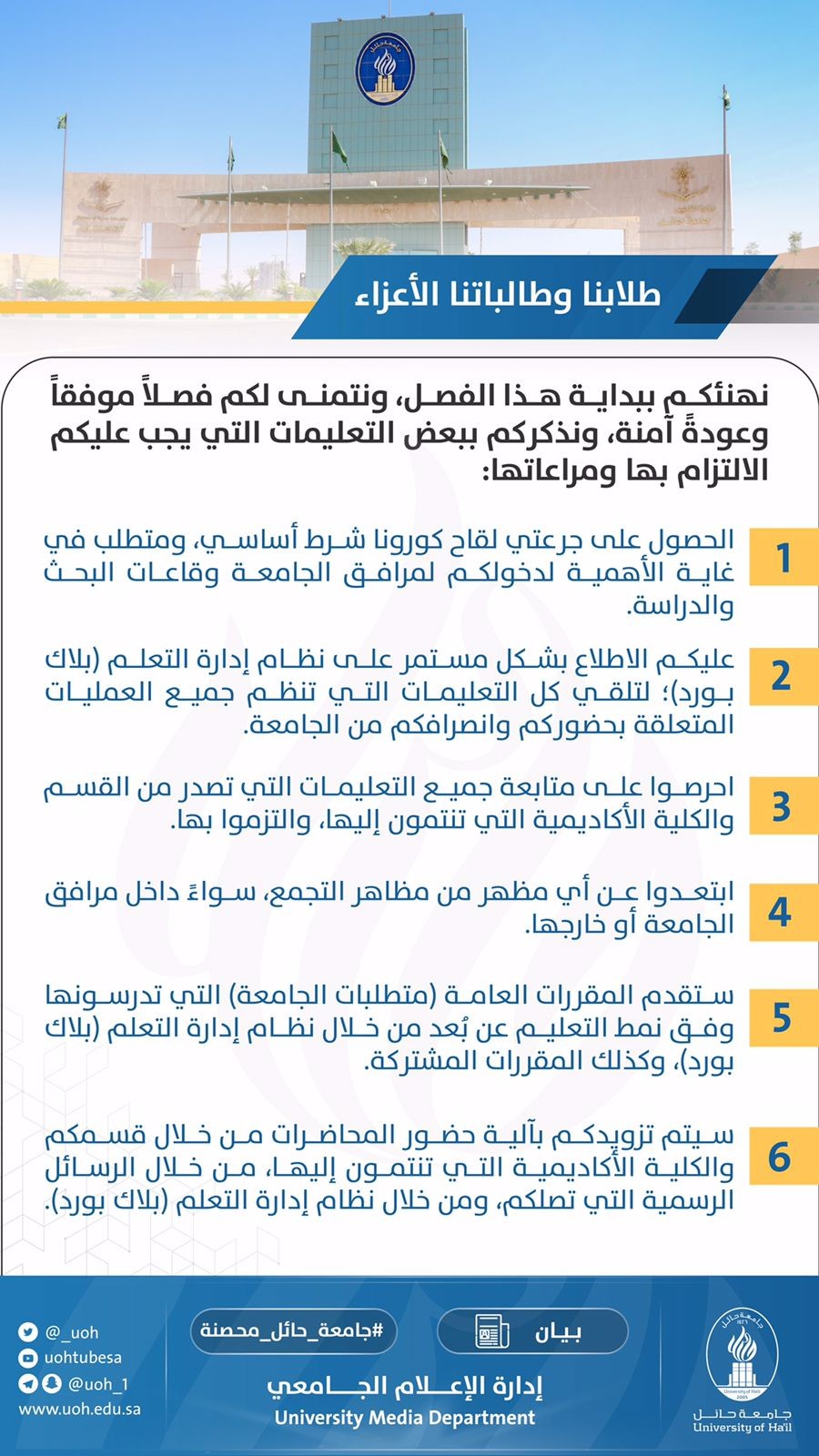 تواصل جامعة حائل جاهزيتها واستعداداتها للعودة الحضورية، وسط تطبيق حزمة من الإجراءات الاحترازية، والتدابير الوقائية التي تضمن للجميع العودة الصحية السليمة، والبيئة التعليمية الآمنة للوقاية من فيروس كورونا كوفيد-19، حرصاً على سلامة الجميع.