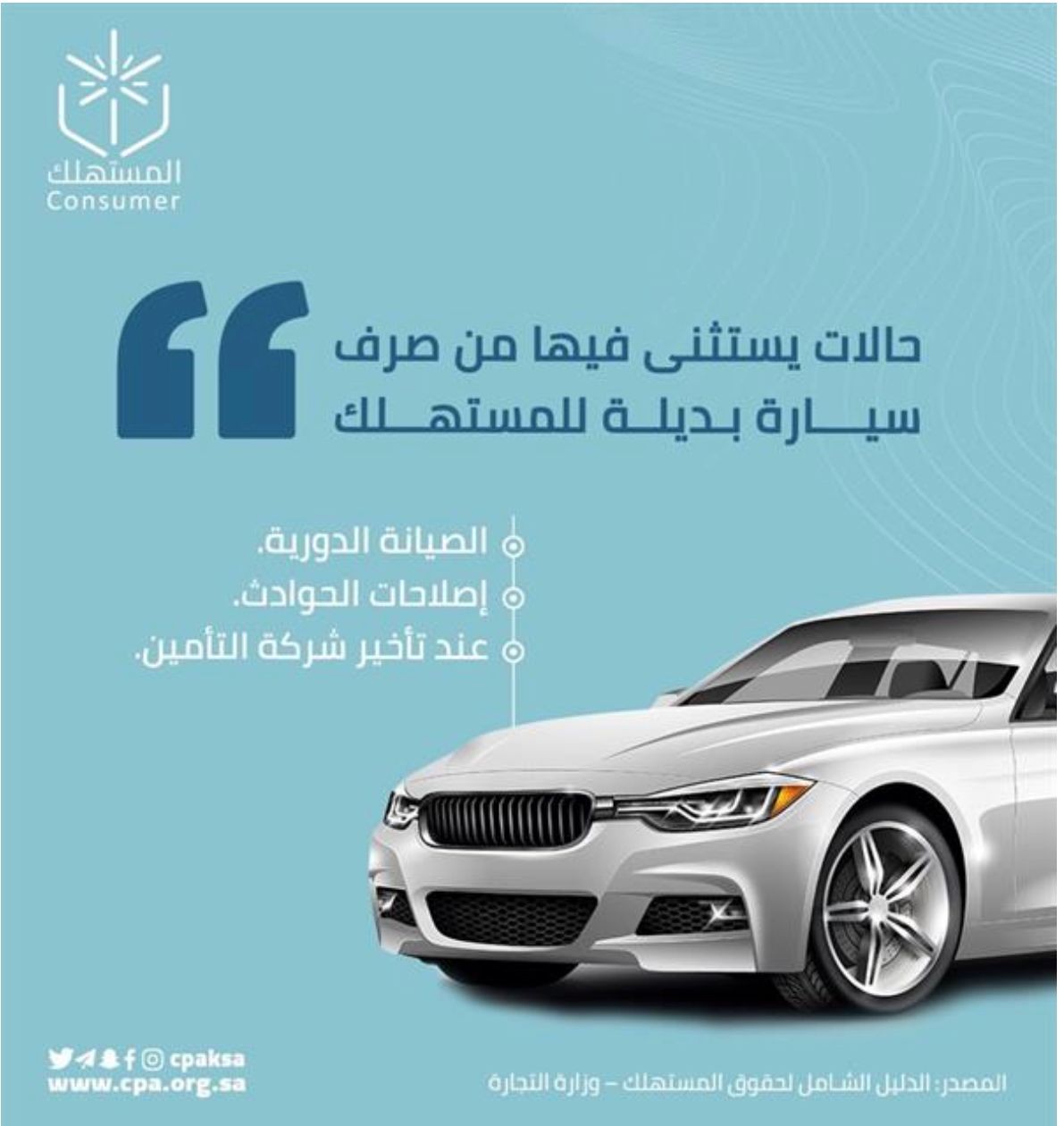 هناك حالات يستثنى فيها صرف سيارة بديلة للمستهلك، وهي عند الصيانة الدورية، وعند إصلاحات الحـوادث، وعند تأخير شركات التأمين.