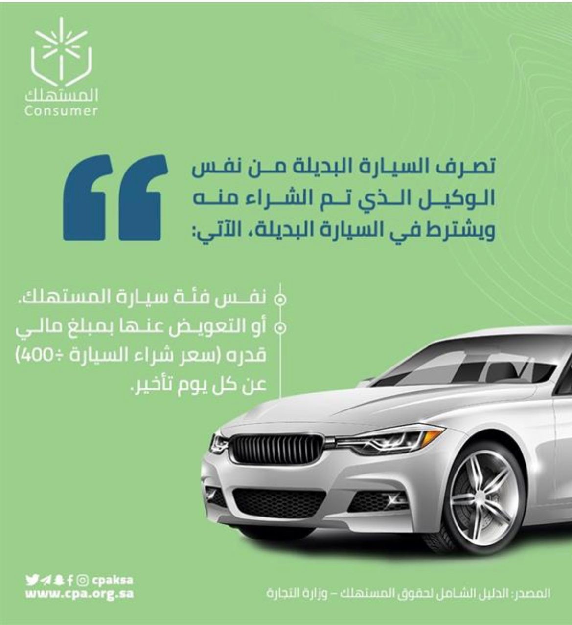 يجب أن تصرف السيارة من نفس الوكيل الذي تم الشراء منه، ويشترط في السيارة البديلة أن تكون من نفس فئة سيارة المستهلك، أو التعويض عنها بمبلغ مالي قدره (سعر شراء السيارة مقسوماً على 4) عن كل يوم تأخير.
