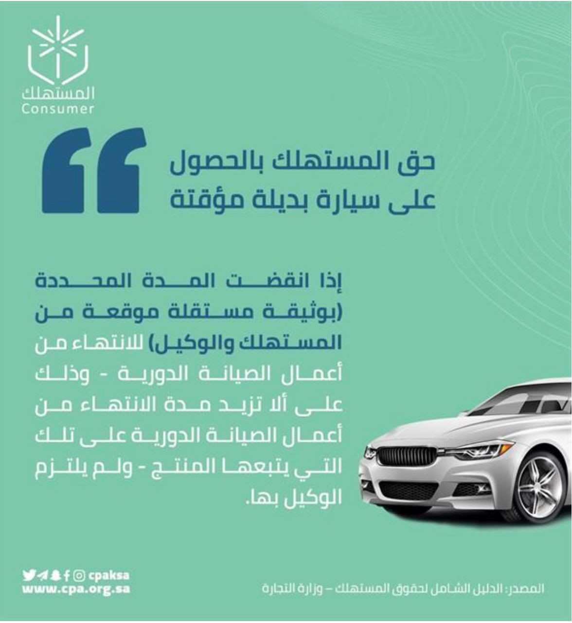 وقالت الجمعية إن الوكيل ملزم بتوفير سيارة بديلة بشكل مؤقت، في حال تأخره عن تسليم المستهلك قطع الغيار ذات الطلب المستمر مباشرة، أو ذات الطلب النادر خلال 14 يوماً من تاريخ الطلب، إذا تعذر انتفاع المستهلك بالسيارة لخلل مشمول بالضمان.