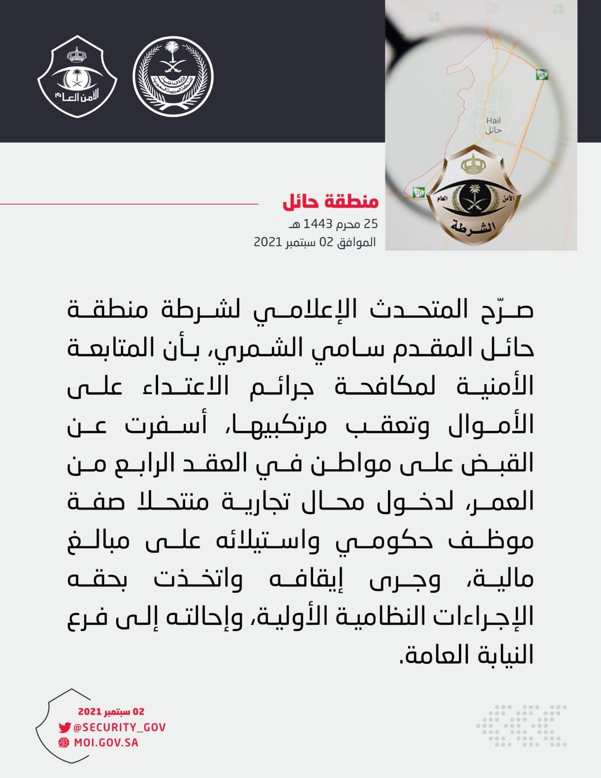 صرّح المتحدث الإعلامي لشرطة منطقة حائل المقدم سامي بن فهيد الشمري ، بأن المتابعة الأمنية لمكافحة جرائم الاعتداء على الأموال وتعقب مرتكبيها، أسفرت - بفضل الله - عن تمكن الجهة المختصة بشرطة المنطقة من القبض على مواطن بالعقد الرابع من العمر قام بإنتحال صفة مفتش بمكتب العمل والإستيلاء على مبالغ مالية من أحد المحلات التجارية .