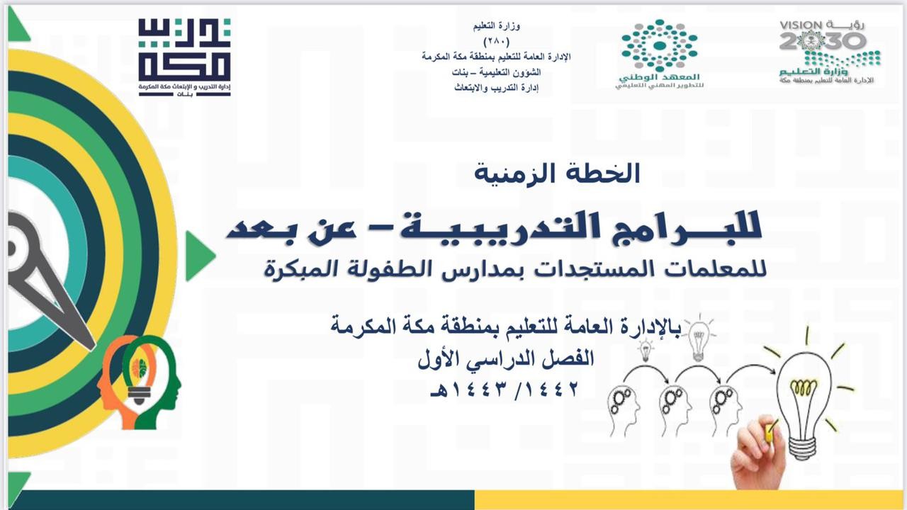 أطلقت الإدارة العامة للتعليم بمنطقة مكة المكرمة ممثلةً بإدارة التدريب والابتعاث يوم الأحد الموافق  28 / 1/ 1443هـ، خطتها التدريبية للمعلمات المستجدات في مدارس الطفولة المبكرة لعام 1443هـ وذلك بواقع 136 ساعة تطوير مهني خلال 34 يوم متواصلة، تشمل  22 برنامجا تدريبيا مهنيا تطويريا.