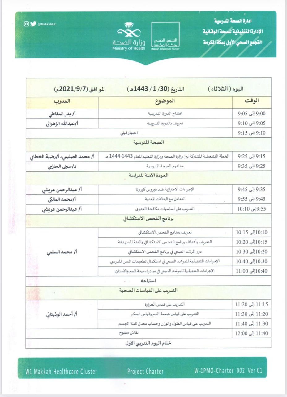 جدير بالذكر أن محاور البرنامج تمثلت في توضيح الخطة التشغيلية المشتركة بين وزارة الصحة ووزارة التعليم ، مفاهيم الصحة المدرسية والبرامج والمبادرات الخاصة بها، العودة الآمنة للدراسة والسلامة في المجتمع المدرسي ، برنامج الفحص الاستكشافي ، والقياسات الصحية الهامة.