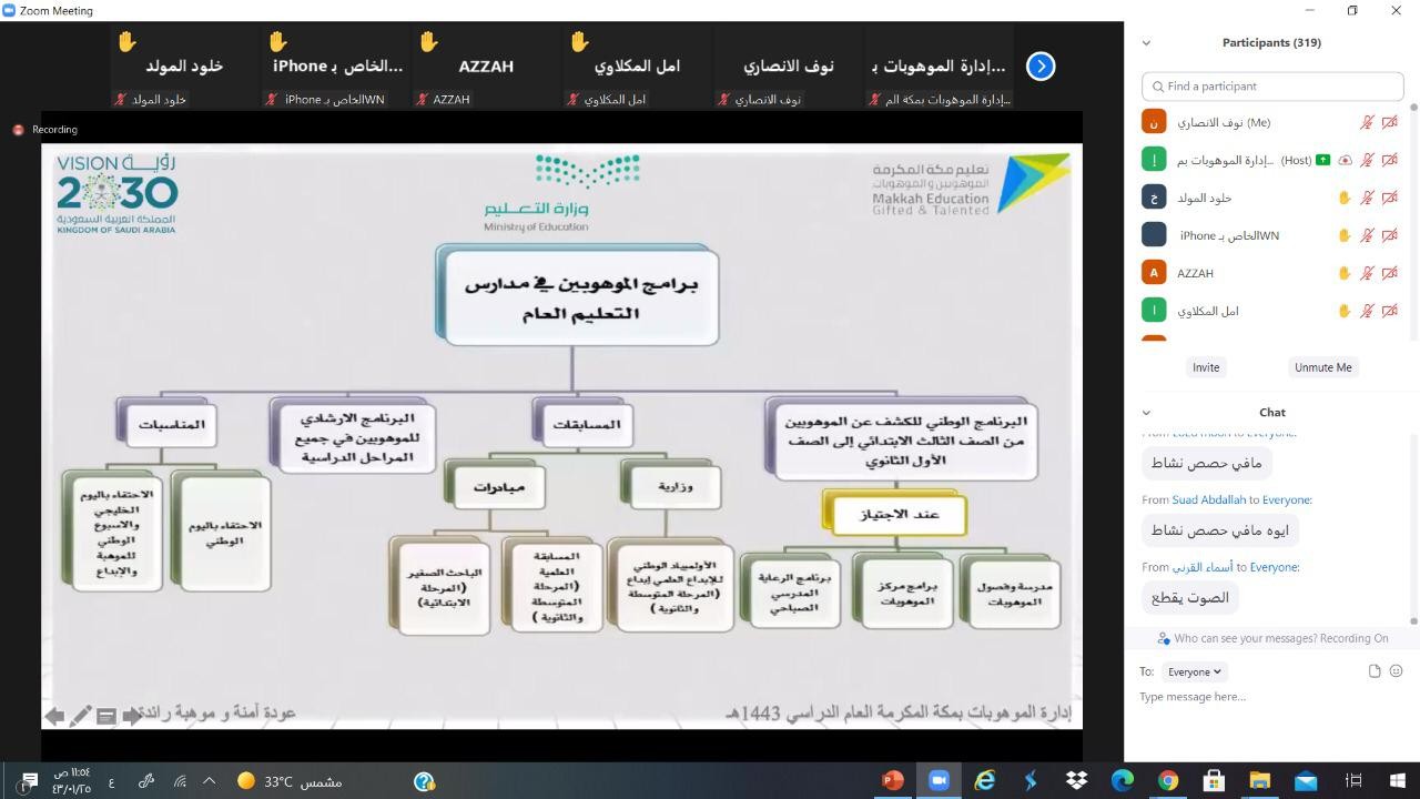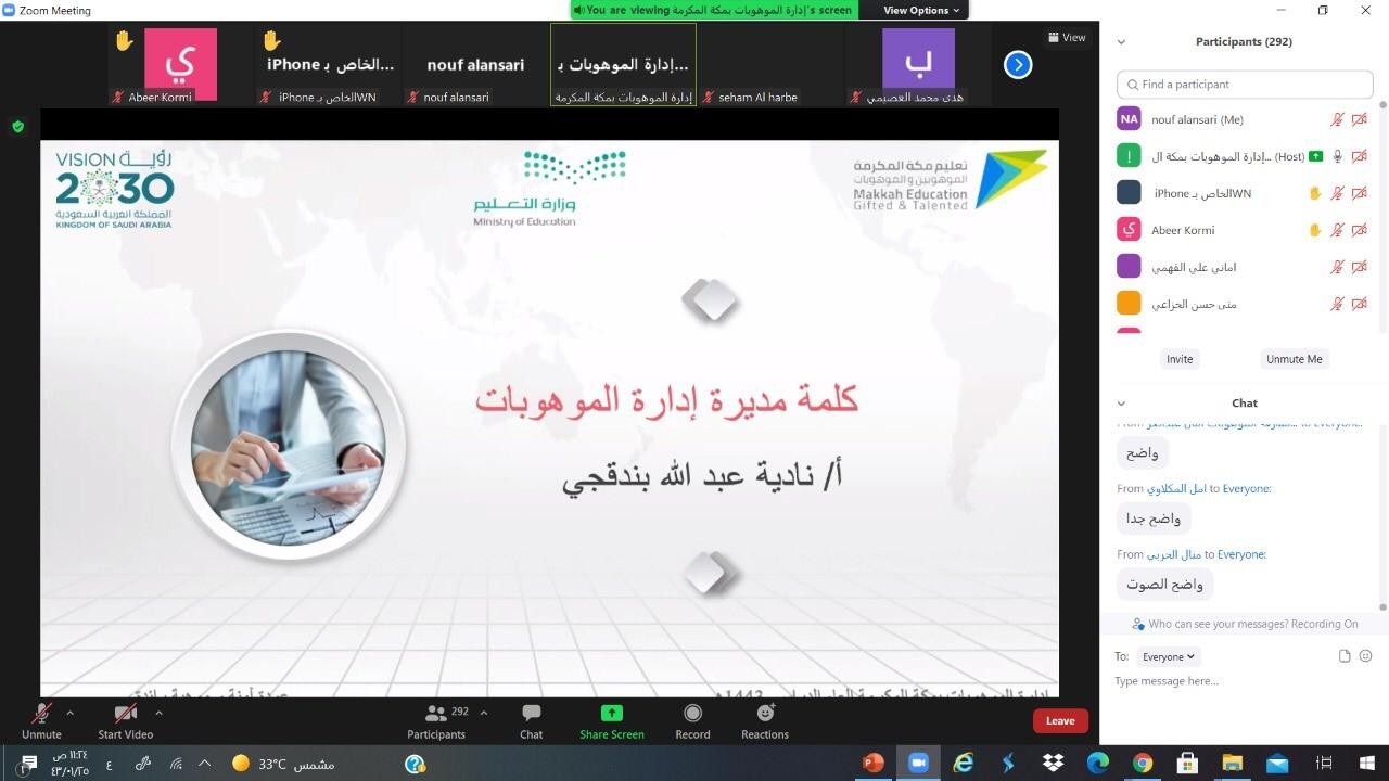 عقدت الإدارة العامة للتعليم بمنطقة مكة المكرمة ممثلةُ بإدارة الموهوبات يوم الخميس الموافق 25 / 1 /1443هـ، اللقاء الاستطلاعي الأول لمنسقات الموهوبات ومعلمات الرعاية في مدارس التعليم العام المرحلة الابتدائية - المرحلة المتوسطة - المرحلة الثانوية بعنوان (عودة آمنة وموهبة رائدة) عبر منصة نفذهُ مشرفات إدارة الموهوبات بإشراف مديرة الإدارة نادية بندقجي (zoom )