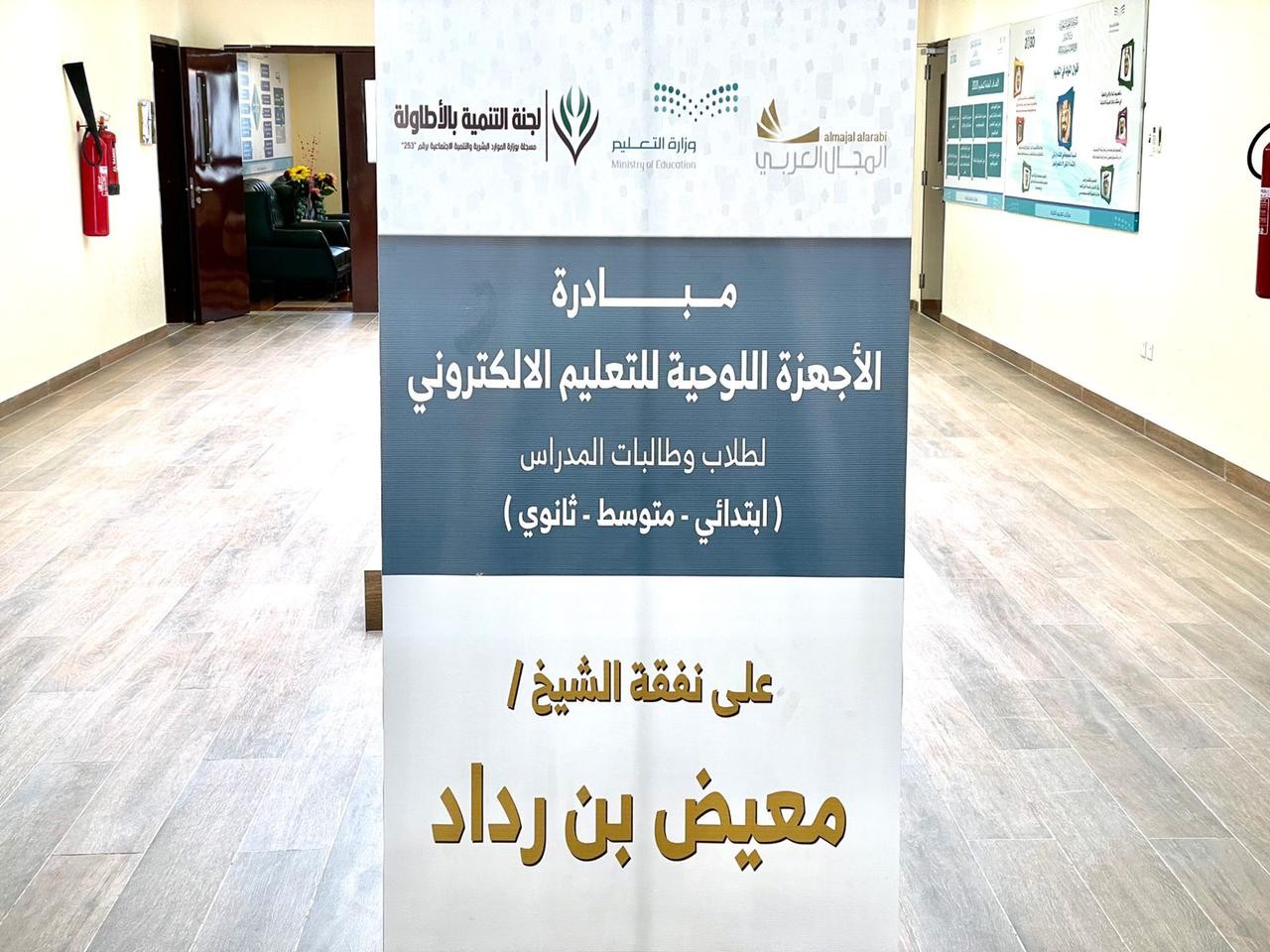 ضمن برامج الشراكة المجتمعية بين لجنة التنمية بالأطاولة ومكتب التعليم بالقرى وبحضور وتشريف محافظ القرى هزاع بن ناصر بن قرملة تم صباح الاثنين 6 صفر 1443هـ تدشين مبادرة الأجهزة اللوحية للتعليم الالكتروني بدعم من رجل الأعمال الشيخ / معيض بن رداد.