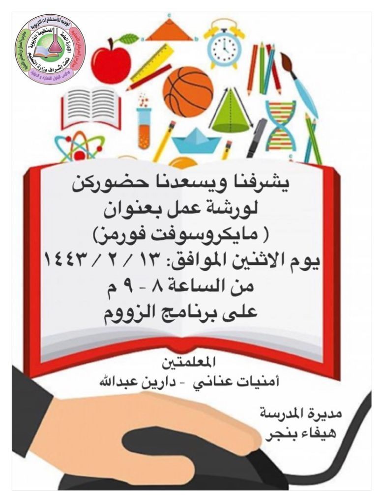 نفذت ابتدائية البتول الأهلية التابعة لمكتب تعليم شمال مكة بالإدارة العامة للتعليم بمنطقة مكة المكرمة يوم الإثنين الموافق 13 / 2 / 1443هـ، ورشةً تدريبيةً بعنوان (مايكروسوفت فورمز) نفذته المعلمتين أمنيات عناني، دارين عبد الله بإشراف القائدة هيفاء بنجر وذلك بهدف الارتقاء بأداء المعلمين وزيادة مؤهلاتهم وتطوير مهاراتهم حيثُ تكون المعلمة قادرة على رفع الاختبار وارساله وتصحيحه من خلال برنامج (مايكروسوفت فورمز).