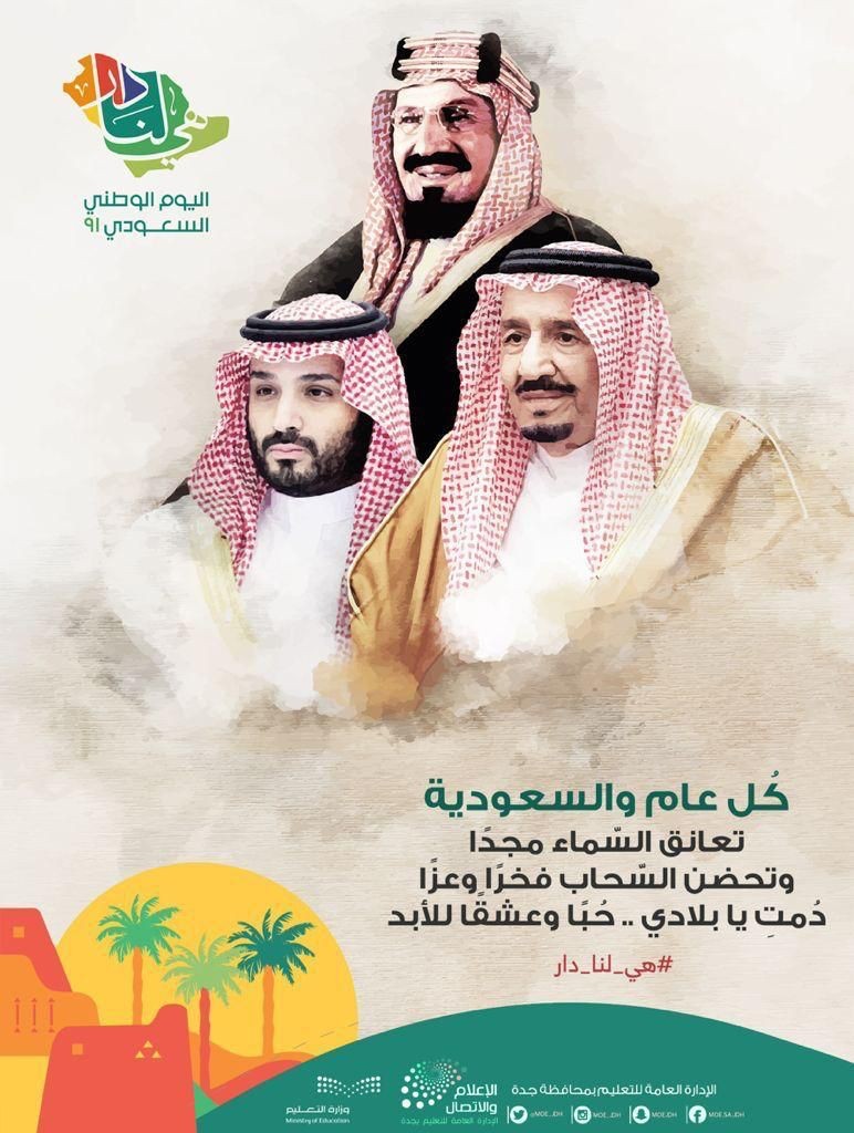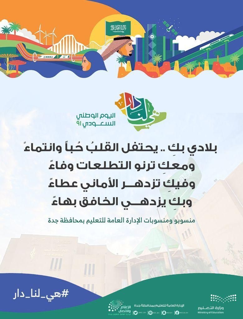 تحت رعاية مستشار أمير منطقة المكرمة، محافظ جدة المكلف، صاحب السمو الأمير سعود بن عبدالله بن جلوي، تحتفي الإدارة العامة للتعليم بجدة بالذكرى الـ 91 لليوم الوطني للمملكة العربية السعودية تحت شعار "هي لنا دار"، وذلك من خلال تنظيم العديد من الفعاليات المتنوعة التي يشارك بها منسوبو ومنسوبات تعليم جدة على مستوى الإدارة العامة والمدارس التابعة لها بنين وبنات.