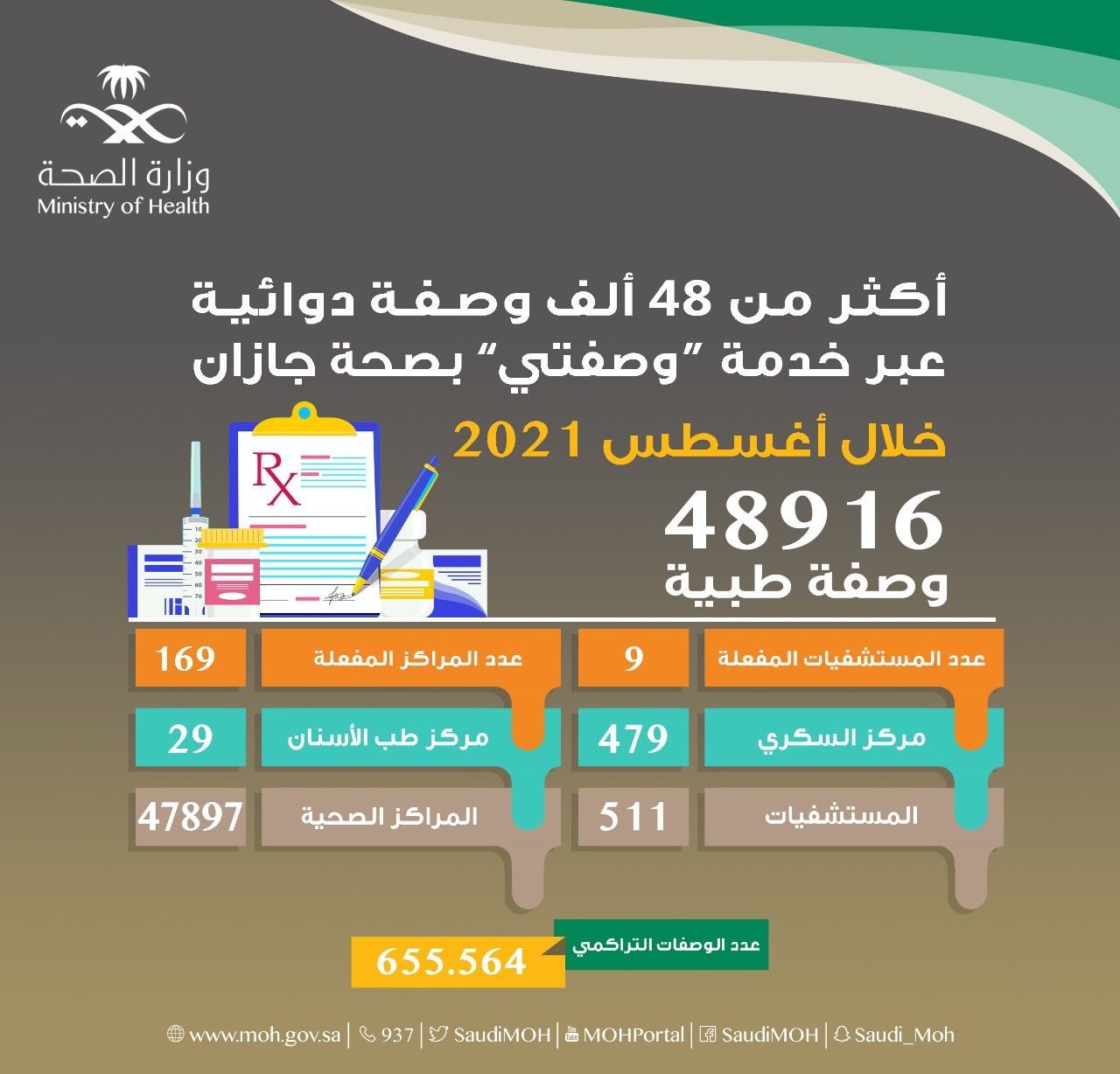 وأشارت الصحة إلى أن العدد التراكمي للوصفات الطبية المصروفة عن طريق خدمة وصفتي ومنذ بدء العمل بها في صحة جازان وحتي نهاية شهر أغسطس الماضي 655564 وصفة .