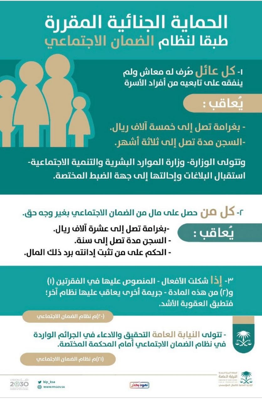 حذرت النيابة العامة من الحصول على أموال من الضمان الاجتماعي دون وجه حق، موضحة أن العقوبة تصل إلى السجن لعام وغرامة 10 آلاف ريال في حال ثبوت ذلك.