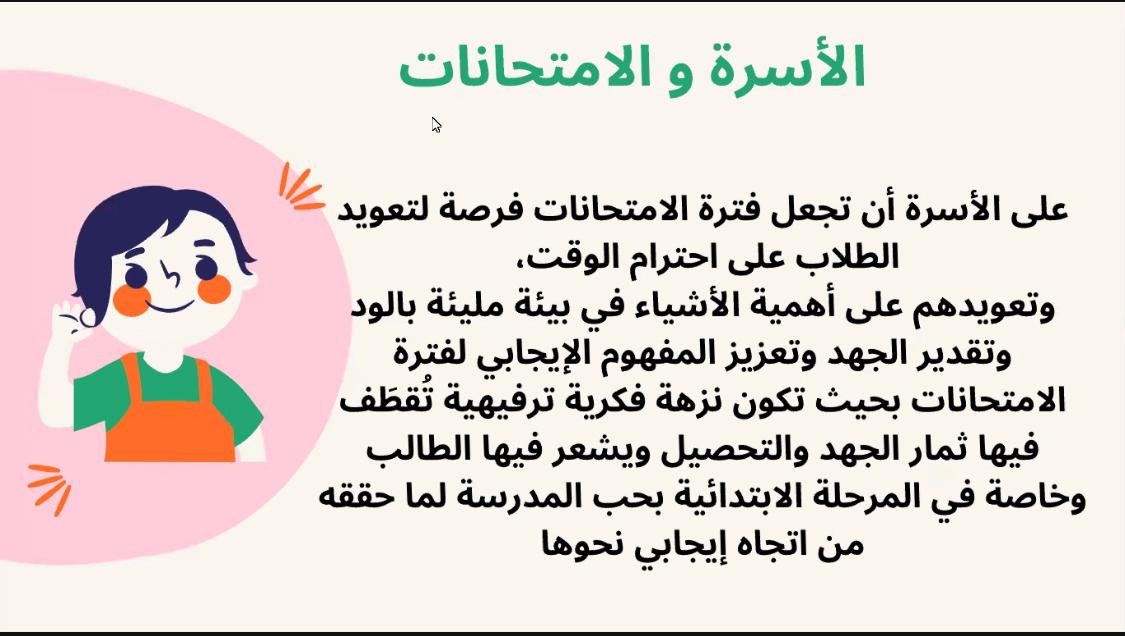 فيما تمثلت محاور الجلسة في عرض مواضيع مميزة كان أهمها (تميزنا قيمنا ) والذي ناقشته المدربة شفاء العمري ، عقبها جلسة بعنوان (أبناؤنا والفهم القرائي)للمدربة حصة الجهني، ثم كان ختام هذه المحاور بمشاركة المدربة جميلة المطيري والتي تحدثت عن (دور الأسرة في الاختبارات عن بعد) وأكدت على دور الأسرة في الاختبارات وأهمية استغلال فترة الامتحانات وأن هذه الفترة يتوجب على أولياء الأمور فيها مضاعفة الجهود بكل جد واستشعار للمسؤولية وأن عليهم التحلي بالصبر من أجل مصلحة أبنائنا الطلاب.