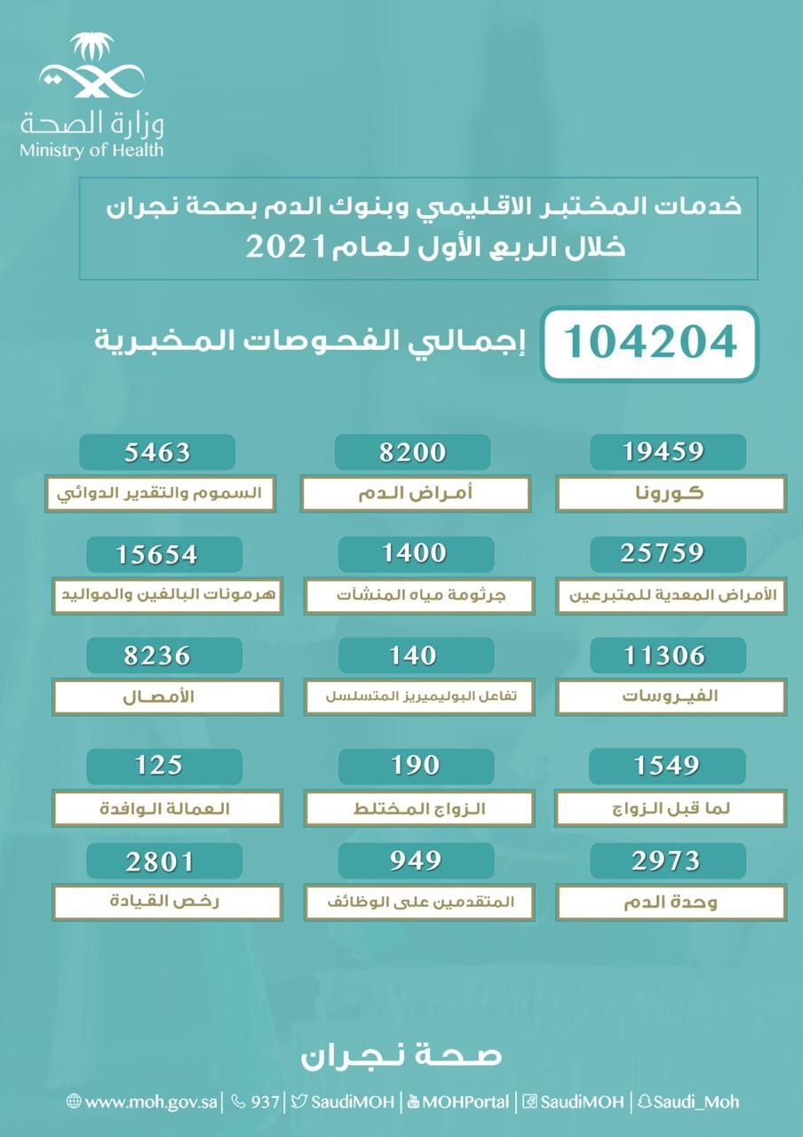 أجرى مختبر الجزيئيات الحيوية بالمختبر الإقليمي بنجران، 19459 فحصاً لفيروس "كورونا"، وذلك خلال الربع الأول من العام 2021.