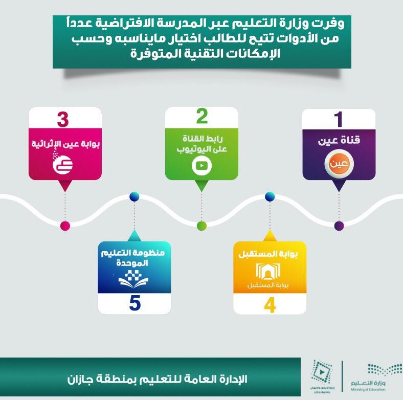 دعت الإدارة العامة للتعليم بمنطقة جازان الطلاب والطالبات للاستفادة من المدرسة الافتراضية والتي وفرتها وزارة التعليم بعد قرار تعليق الدراسة في مؤسسات التعليم العام وذلك من خلال عدة أدوات يمكن للطالب الاختيار منها في الوقت الذي يناسبه، وحسب الإمكانات التقنية المتوفرة لديه، وهي: (قناة عين، رابط القناة على اليوتيوب، بوابة عين الإثرائية، بوابة المستقبل، منظومة التعليم الموحدة).