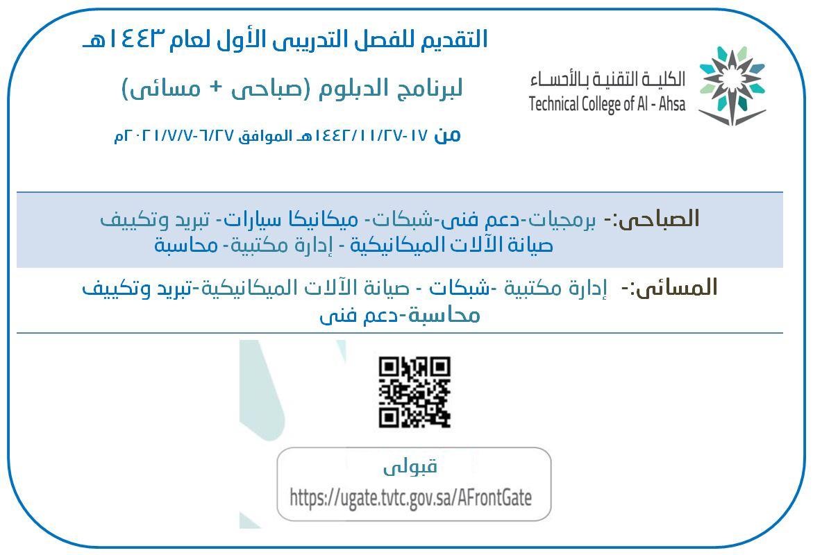 أعلنت الكلية التقنية بالأحساء عن فتح باب القبول للفصل التدريبي الأول من العام 1443هـ في برنامج الدبلوم الصباحي والمسائي التطبيقي لخريجي الثانوية العامة والمعاهد الثانوية اعتباراً من اليوم الأحد 17 / 11 / 1442هـ ويستمر التسجيل إلى   27 / 11 / 1442هـ ، عبر بوابة القبول الموحد بموقع المؤسسة العامة للتدريب التقني والمهني "قبولي "( https://ugate.tvtc.gov.sa/AFrontGate/ ).