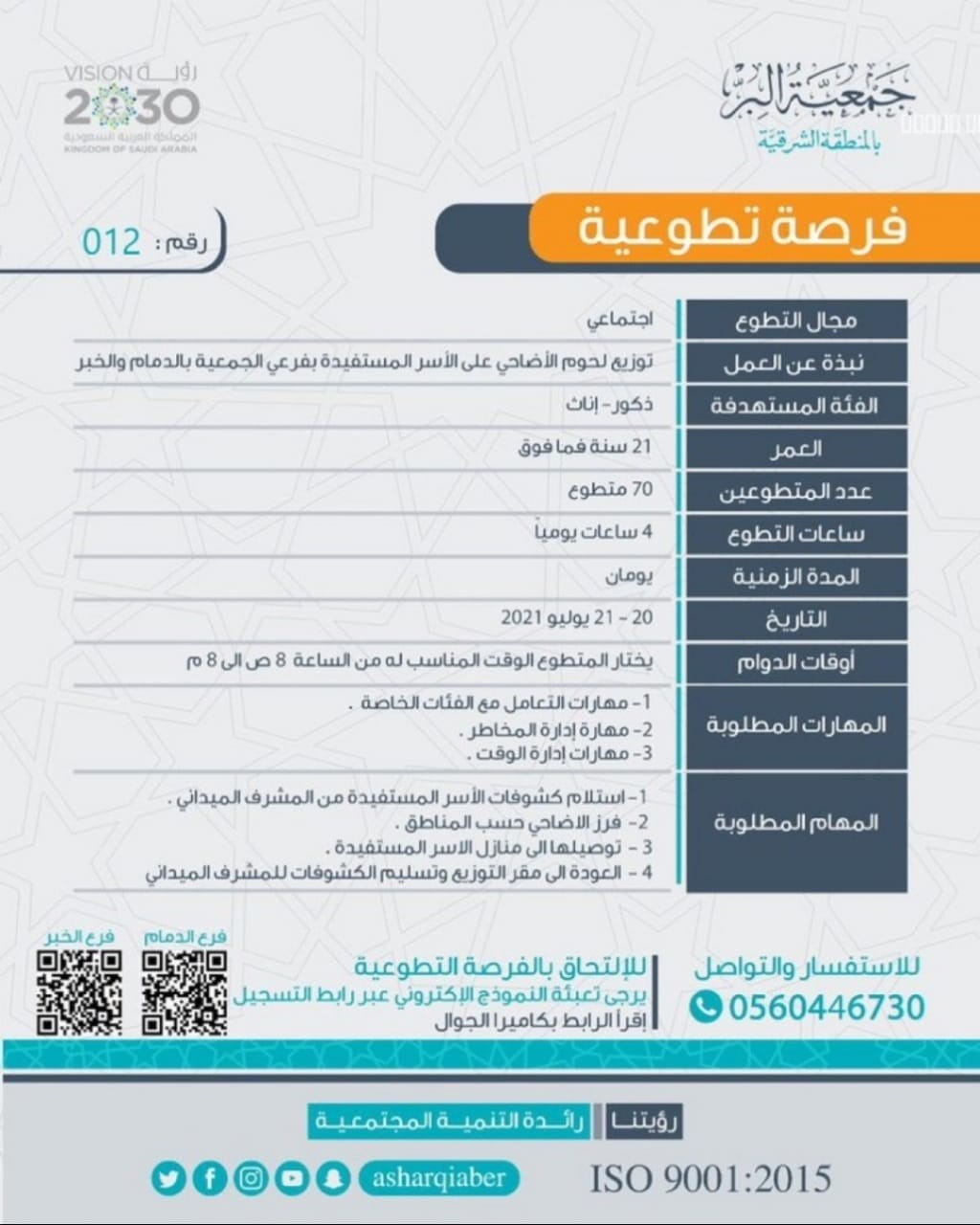طرحت جمعية البر بالمنطقة الشرقية عبر المنصة الوطنية للعمل التطوعي 70 فرصة تطوعية تهدف لتوزيع لحوم الأضاحي 1442 على المستحقين بالمنطقة الشرقية .