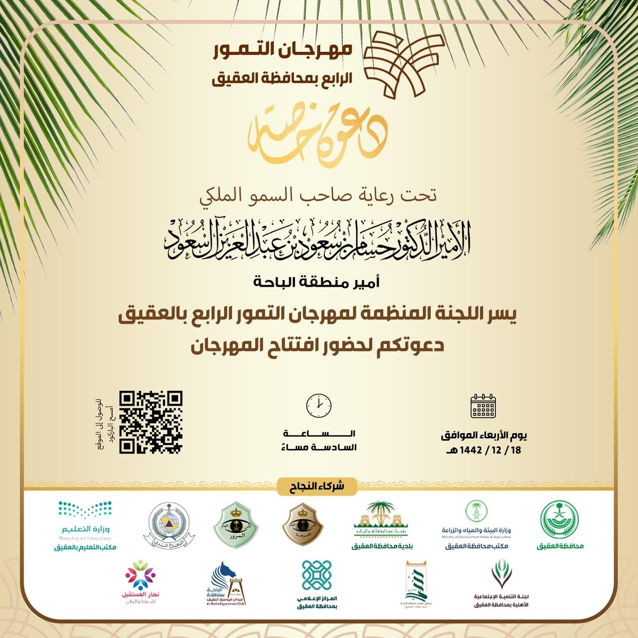 تنطلق في محافظة العقيق بمنطقة الباحة الأربعاء المقبل فعاليات مهرجان التمور في نسخته الرابعة .