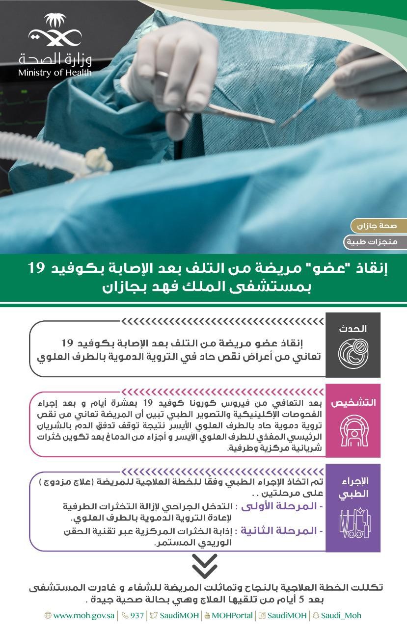 وفي التفاصيل ذكرت صحة جازان بأن المريضة حضرت الى قسم الطوارئ عن طريق التحويل من احدى المستشفيات الطرفية بعد التعافي من فيروس كورونا كوفيد 19 بعشرة أيام، وبعد إجراء الفحوصات الإكلينيكية والتصوير الطبي تبين ان المريضة تعاني وجود نقص تروية دموي حاد بالطرف العلوي الأيسر نتيجة توقف تدفق الدم بالشريان الرئيسي المغذي للطرف العلوي الأيسر وأجزاء من الدماغ بعد تكوين تخثرات شريانية مركزية وطرفية.