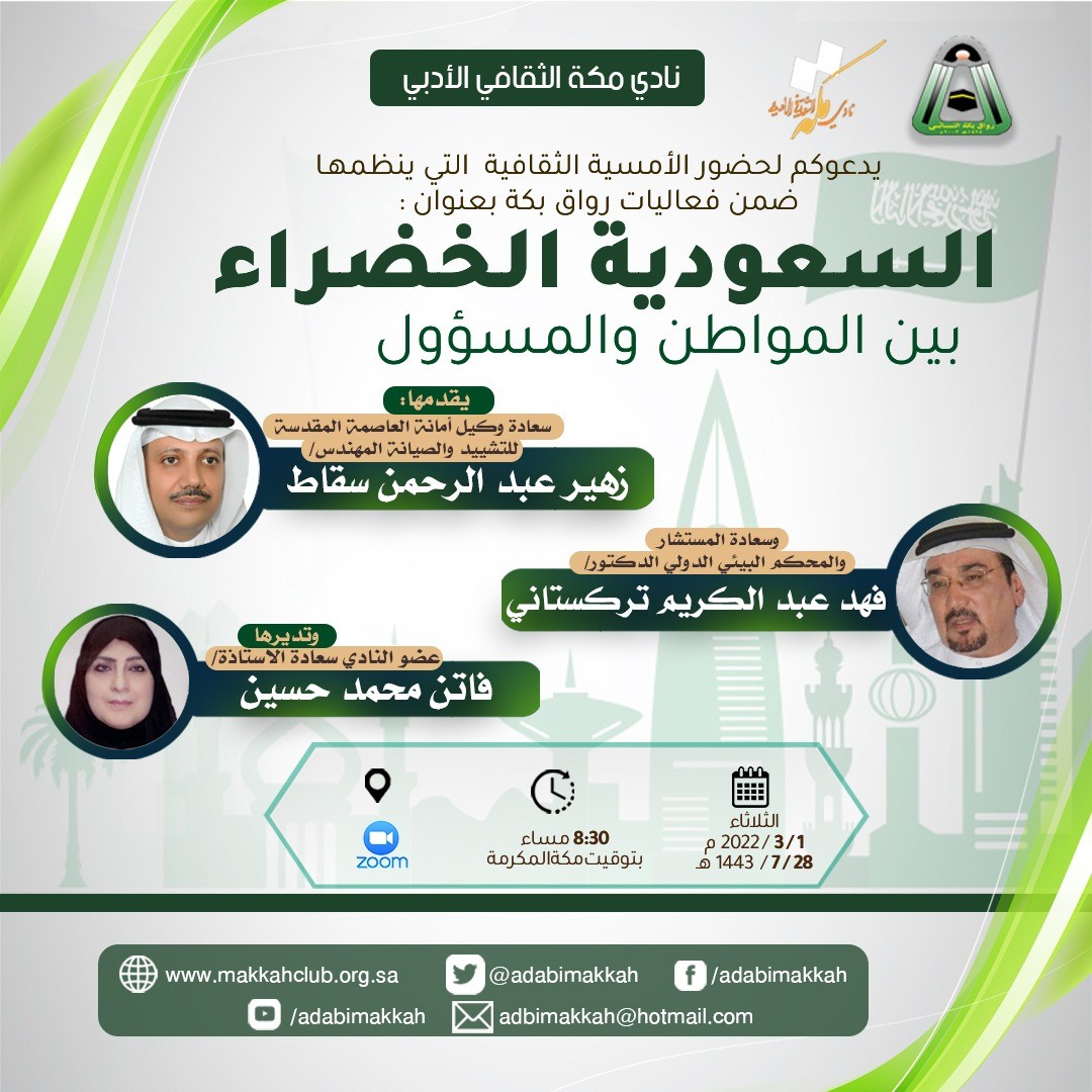 ضمن الفعاليات والأنشطة والبرامج الثقافية التي ينظمها نادي مكة الثقافي الأدبي بمكة المكرمة - تقام أمسية الثقافية والتي ينظمها ضمن فعاليات رواق بكة بعنوان : (السعودية الخضراء بين المواطن والمسؤول) بمشاركة سعادة المهندس زهير عبدالرحمن سقاط وكيل أمانة العاصمة المقدسة للتشييد والصيانة و الدكتور فهد عبدالكريم تركستاني ، المحكم البيئي الدولي.