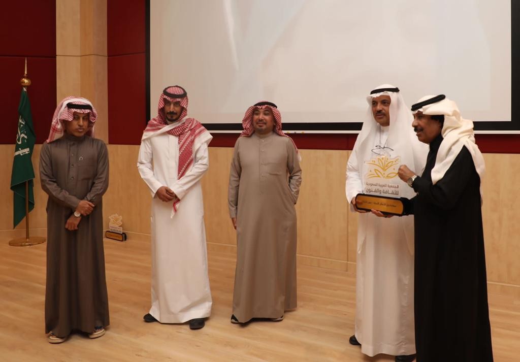 وفي نهاية الأمسيه قام مدير الجمعية الاستاذ خلف بن حمود القاران بتقديم درع لشاعر الأمسية الدكتور صالح الشادي ودرعين للراعي الاستاذ معن الشاذلي وللغرفة التجارية بالمنطقه ثم التقطت صوره تذكاريه للضيف مع منسوبي الجمعية