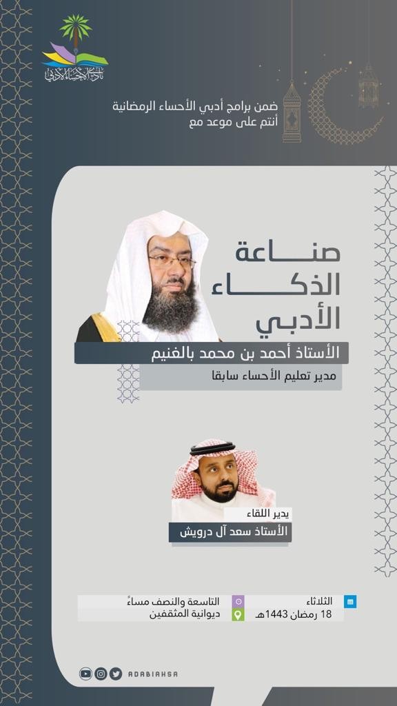 ضمن برامجه الثقافية خلال شهر رمضان المبارك تستضيف ديوانية المثقفين في النادي عند الساعة التاسعة والنصف من مساء الثلاثاء ١٨ رمضان الجاري الموافق ١٩ أبريل ٢٠٢٢م الأستاذ أحمد بن محمد بالغنيم مدير عام التعليم بمحافظة الاحساء سابقا في حديث عن "صناعة الذكاء الأدبي" ويدير اللقاء الأستاذ سعد آل درويش ، وتجدر الإشارة إلى أن نادي الأحساء الأدبي قد وضع خطة للبرامج الرمضانية بدأت من أول شهر رمضان المبارك وحفلت بحضور كبير من المثقفين والأدباء رجالا ونساء .