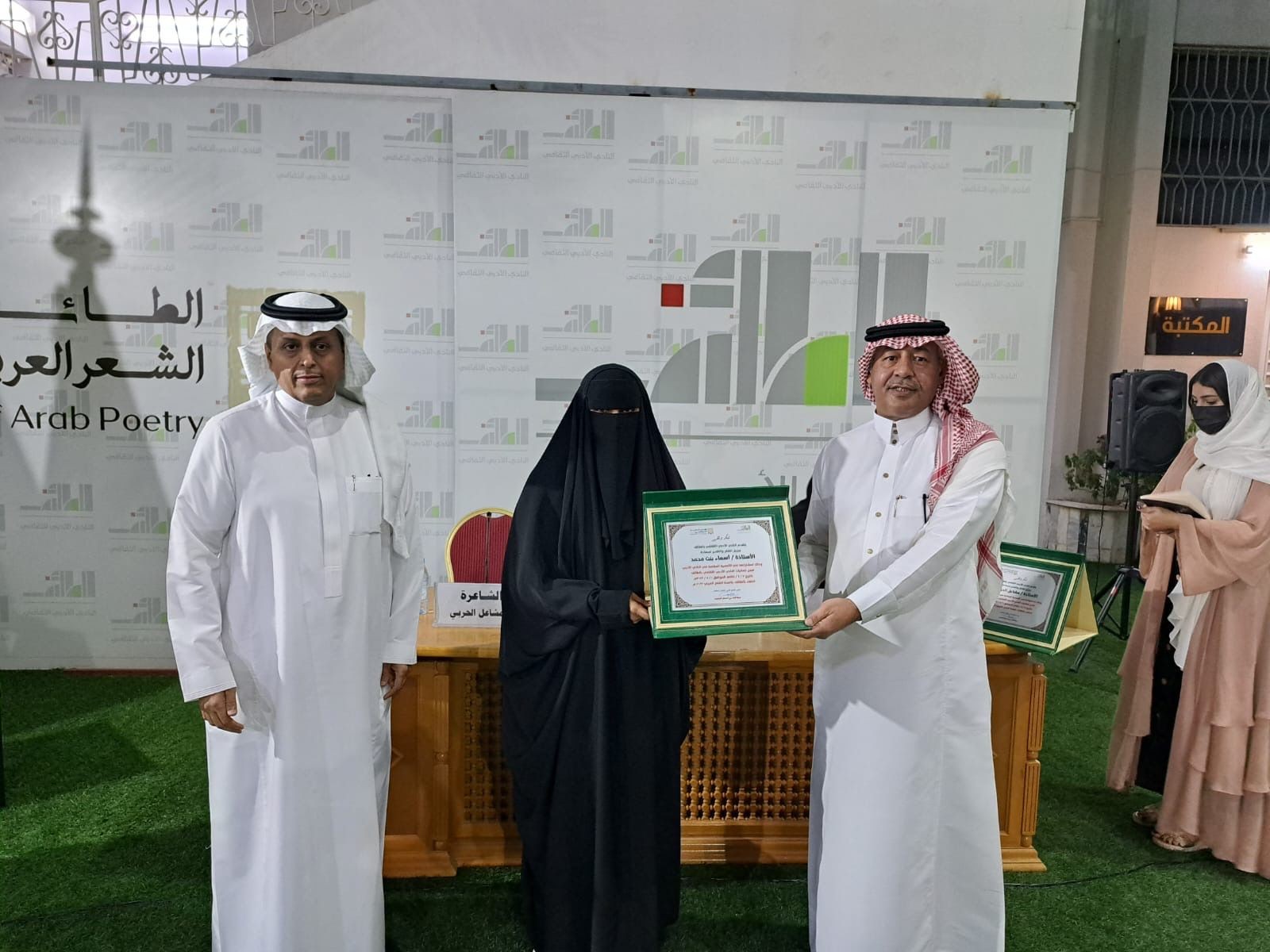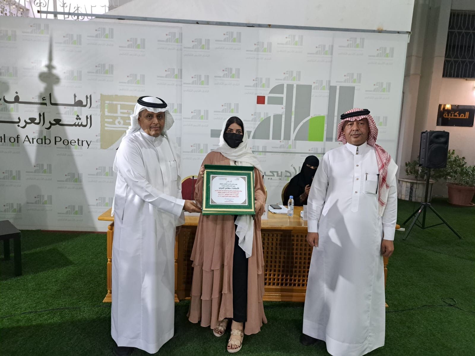 وفي ختام الأمسية قام رئيس النادي الأدبي الثقافي بالطائف/ الأستاذ عطا الله الجعيد بعد مداخلته بمشاركة الدكتور أحمد الهلالي، في تكريم الشاعرات ومديرة الأمسية والتقاط الصور التذكارية، ثم وقعت الشاعرة مشاعل الحربي ديوانها( خارج الوقت ) للحضور كما أهدت نسخا منه لمكتبة النادي .