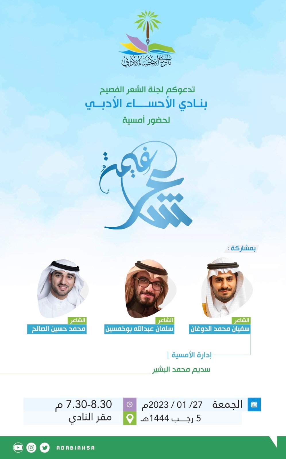 ووجه الدكتور ظافر الشهري رئيس النادي الأدبي بالأحساء الدعوة لمحبي الشعر لحضور الأمسية التي ستكون بحول الله ليلة شعرية مميزة وتأتي في أطار دعم النادي للشعراء الشباب وهي باكورة أنشطة لجنة الشعر الفصيح التي تم تأسيسها مؤخراً في النادي وتتبعها بحول الله عدة أمسيات وبرامج نوعية متعلقة بالشعر الفصيح .
