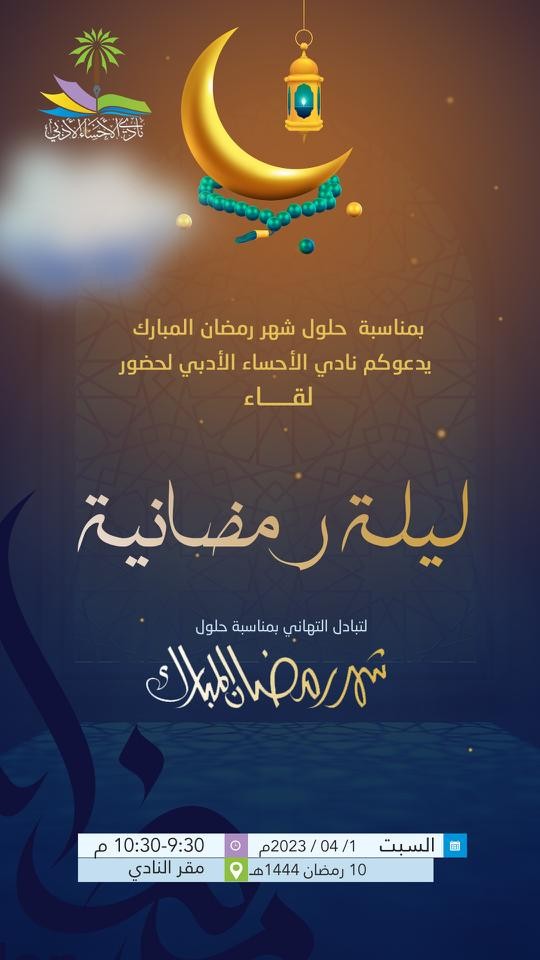 ينظم نادي الأحساء الأدبي للأدباء والمثقفين والإعلاميين ليلة رمضانية بمناسبة شهر رمضان المبارك ، مساء السبت العاشر من شهر رمضان المبارك 1444هـ الموافق الأول من شهر ابريل 2023م ، وقد وجه النادي عبر حساباته على وسائل التواصل الإجتماعي الدعوة للجميع لحضور هذه الليلة المفتوحة.