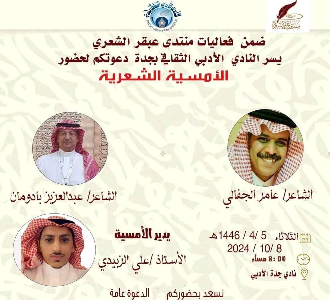 ينظم منتدى عبقر الشعري بالنادي الأدبي الثقافي بجدة غدًا الثلاثاء أمسية شعرية مع الشعراء عامر الجفالي، وعبدالعزيز بادومان، يدير الأمسية الشاعر علي الزبيدي عضو منتدى عبقر الشعري، وذلك في تمام الساعة الثامنة مساءً بمقر النادي.