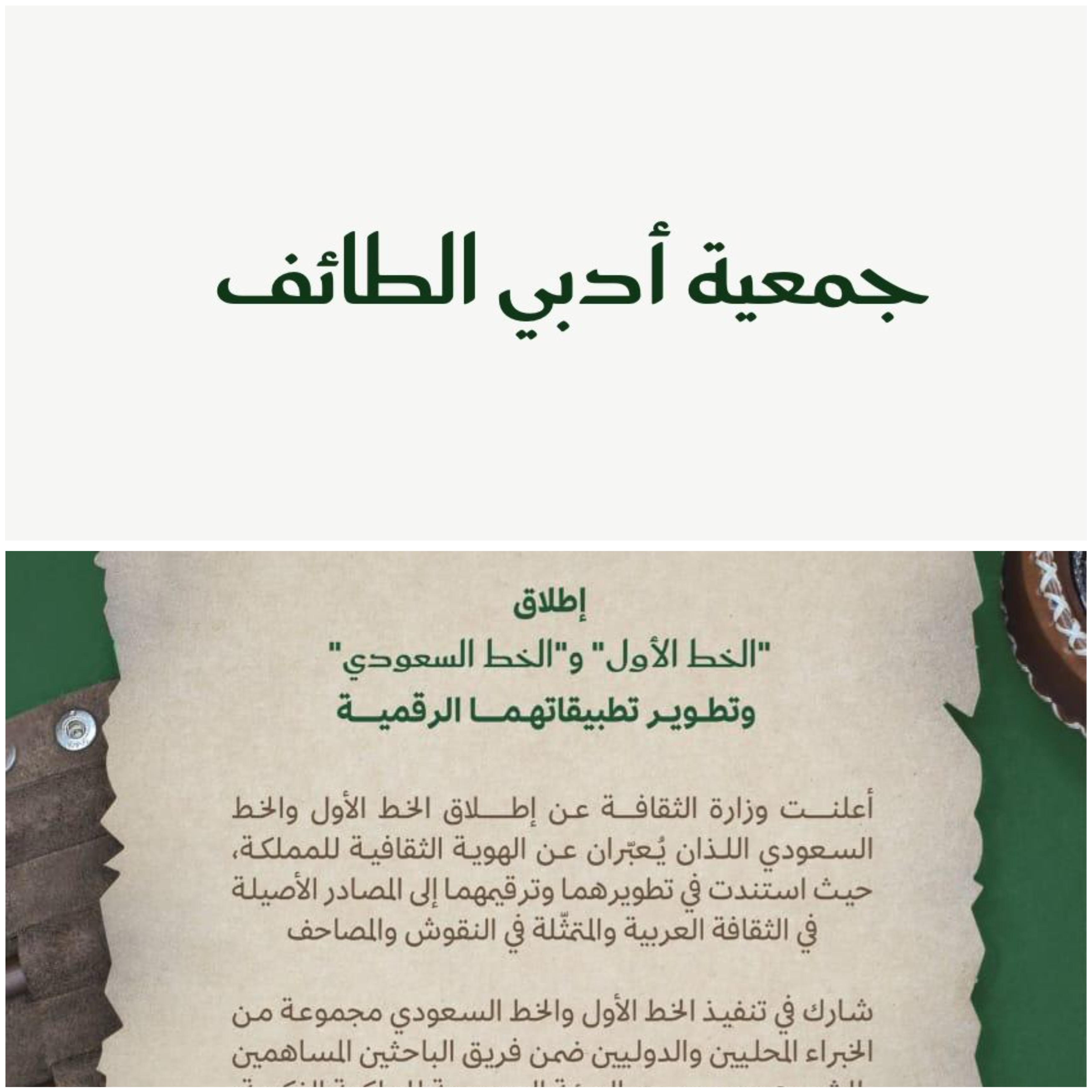 اعتمد مجلس إدارة جمعية أدبي الطائف الخط الأول والخط السعودي - الذي أعلنته وزارة الثقافة - في جميع المخاطبات الرسمية وكذلك طباعة الكتب والإصدارات المختلفة الصادرة عن الجمعية .