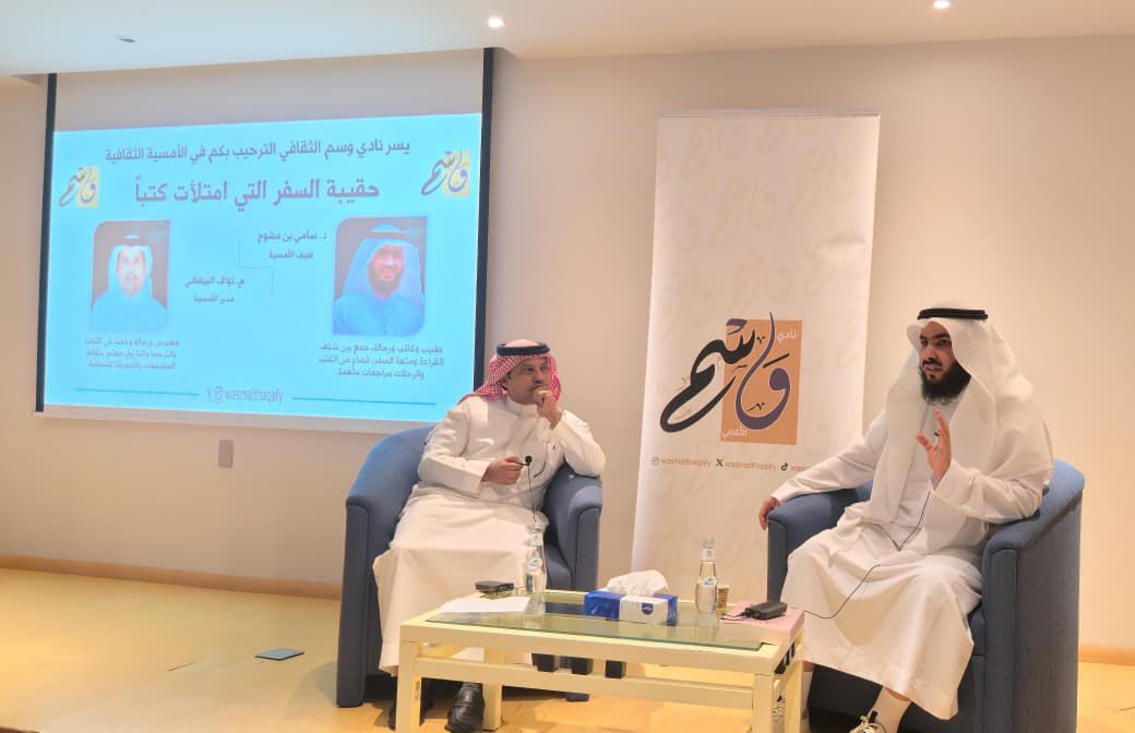 يواصل نادي وسم الثقافي تقديم برامجه المميزة عبر أمسية حملت عنوان “حقيبة السفر التي امتلأت كتباً”، استضاف فيها الكاتب والطبيب الرحالة الدكتور سامي بن مشوح، مساء الأربعاء، في قاعة الجزيرة بغرفة الشرقية.