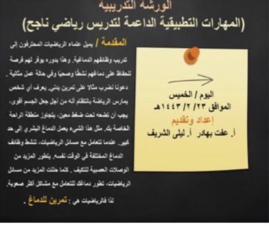 نفذت الإدارة العامة للتعليم بمنطقة مكة المكرمة ممثلة في مكتب تعليم وسط مكة برنامجًا بعنوان " المهارات التطبيقية الداعمة لتدريس رياضي ناجح" يوم الخميس الموافق ٢٣/ ٢/ ١٤٤٣هـ، نفذته المشرفتان التربويتان عفت بهادر وليلى الشريف بالقاعة الافتراضية من خلال برنامج (Microsoft Teams) وذلك بحضور مساعدة الشؤون التعليمية د/غيداء البرعي وتحت إشراف مديرة مكتب الوسط سارة الدعجاني .
