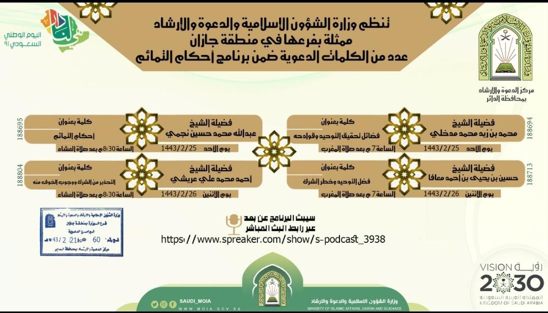 تنظم وزارة الشؤون الإسلامية والدعوة والإرشاد ممثلة بفرعها في منطقة جازان عدد من الكلمات الدعوية ضمن البرنامج الدعوي أحكام التمائم والتي انطلقت مساء  الأحد السادس والعشرون من شهر صفر ١٤٤٣ هجرية بكلمة عنوانها فضل تحقيق التوحيد وقوادحه لفضيلة الشيخ محمد بن زيد مدخلي التي سيلقيها في تمام السابعة مساءاً وفي ذات الساعة يلقي فضيلة الشيخ حسين بن يحيى معافا كلمة بعنوان فضل التوحيد وخطر الشرك ، وفي تمام الثامنة والنصف مساءا ً يتحدث فضيلة الشيخ عبد الله بن محمد نجمي عن أحكام التمائم . وتختتم هذه الكلمة بكلمة لفضيلة الشيخ أحمد بن محمد عريشي عنوانها التحذير من الشرك ووجوب الخوف منه في تمام الثامنة والنصف من مساء الاثنين السادس والعشرين .