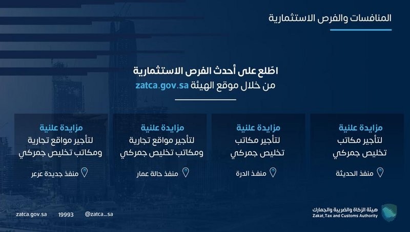 أعلنت هيئة الزكاة والضريبة والجمارك عن طرح عددٍ من الفرص الاستثمارية في أربعة منافذ جمركية، بأسلوب المزايدة العلنية المفتوحة، حيث ستقام هذه المزايدات في منفذ الدرة، ومنفذ حالة عمار، ومنفذ الحديثة، ومنفذ جديدة عرعر الحدودي.