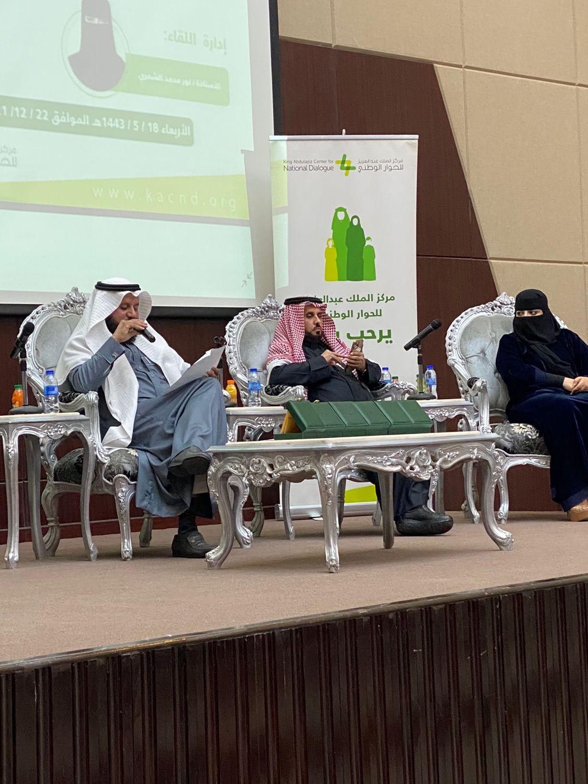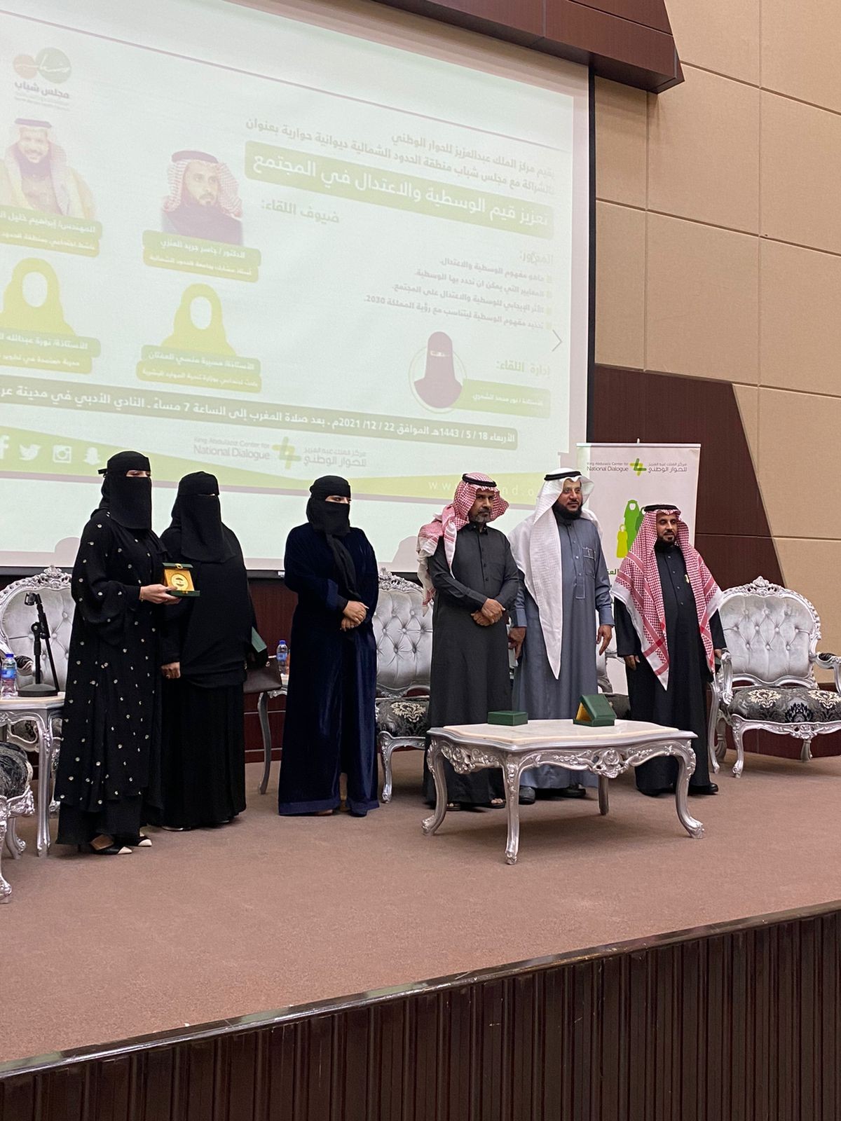 قدم  مركز الملك عبدالعزيز للحوار الوطني بالشراكة مع مجلس شباب منطقة الحدود الشمالية ديوانية حوارية بعنوان تعزيز قيم الوسطية والاعتدال في المجتمع بالنادي الأدبي الثقافي بمنطقة الحدود الشمالية مع الدكتور جاسر جريد أستاذ مشارك في جامعة الحدود الشمالية والمهندس ابراهيم خليل ناشط اجتماعي والاستاذة مسيرة منسي باحثة اجتماعية والاستاذة نورة الحربي مدربة معتمدة في تنمية الذات وقد تطرق الحوار لعدة محاور مهمة منها مفهوم الوسطية والاعتدال والمعايير التي يمكن ان تحدد بها الوسطية وماهو الاثر الايجابي للوسطية والاعتدال على المجتمع أيضًا تحديد مفهوم الوسطية ليتناسب مع رؤية المملكة 2030