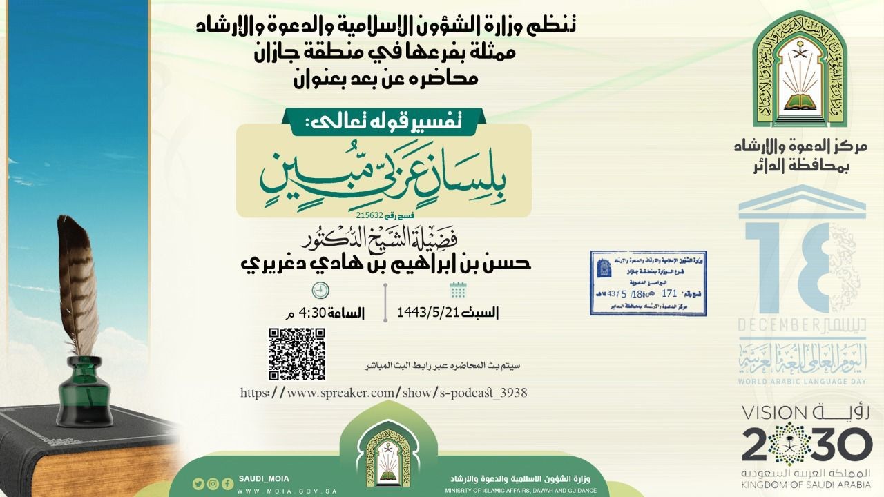 ينظم فرع وزارة الشؤون الإسلامية والدعوة والإرشاد في منطقة جازان ممثلا بمركز الدعوة والإرشاد بمحافظة الدائر بني مالك وتزامنا مع اليوم العالمي للغة العربية محاضرة عبر البث المباشر في تفسير قوله تعالي (بلسان عربي مبين ) يلقيها فضيلة الشيخ الدكتور حسن بن ابراهيم دغريري وذلك في تمام الساعة الرابعة والنصف من مساء السبت الحادي والعشرون من شهر جماد الآخر 1443 هجرية .
