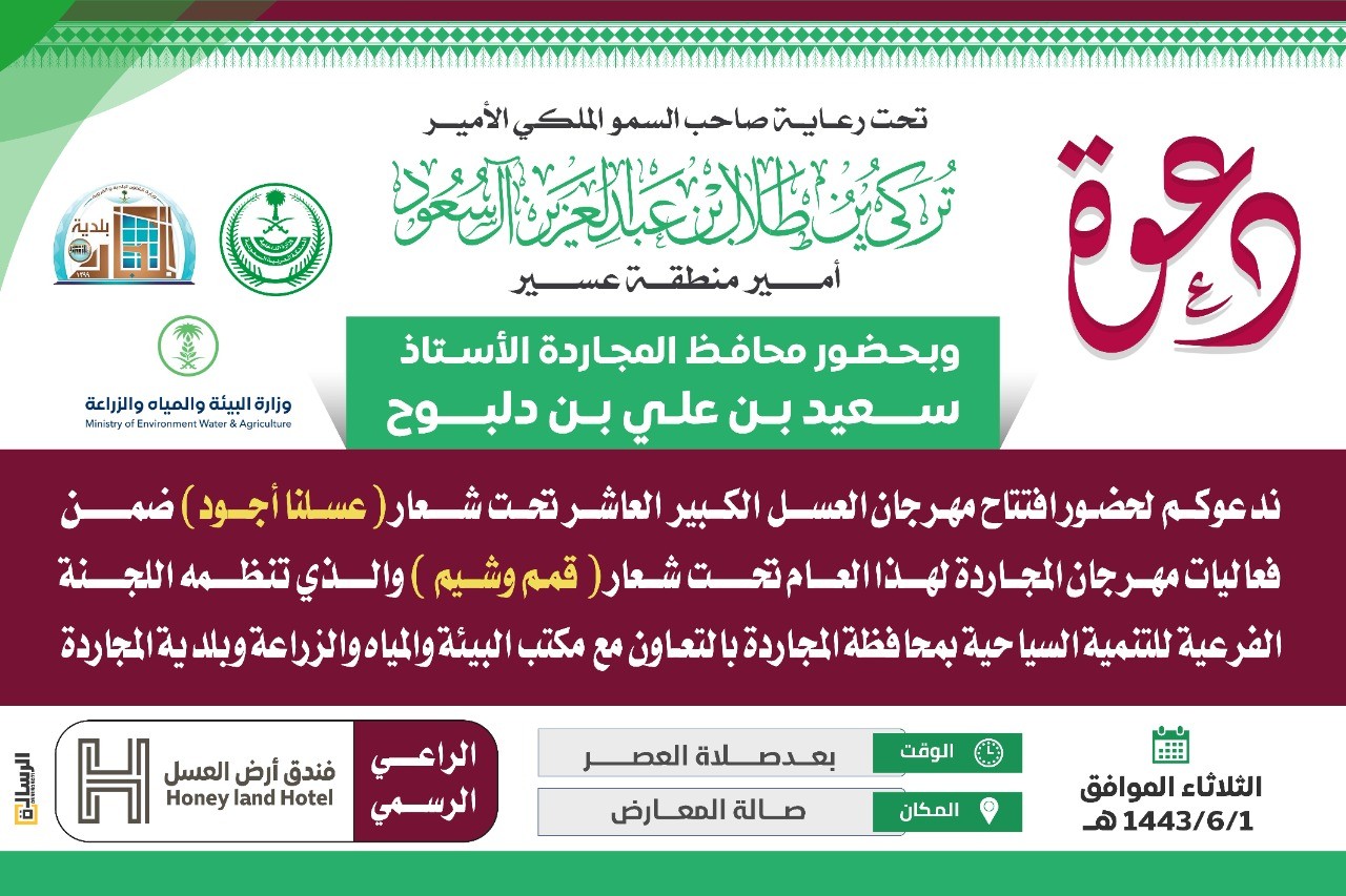 برعاية كريمة وموافقة من سمو أمير منطقة عسير حفظه الله يفتتح محافظ المجاردة الأستاذ سعيد بن علي بن دلبوح عصر يوم الثلاثاء الموافق ١ / ٦/ ١٤٤٣ مهرجان العسل الكبير العاشر تحت شعار "عسلنا أجود" والذي تنظمه اللجنة الفرعية للتنمية السياحية بمحافظة المجاردة بالتعاون مع بلدية المجاردة ومكتب البيئة والزراعة والمياه بالمجاردة ضمن فعاليات مهرجان المجاردة لهذا العام وتحت شعار "قمم وشيم".