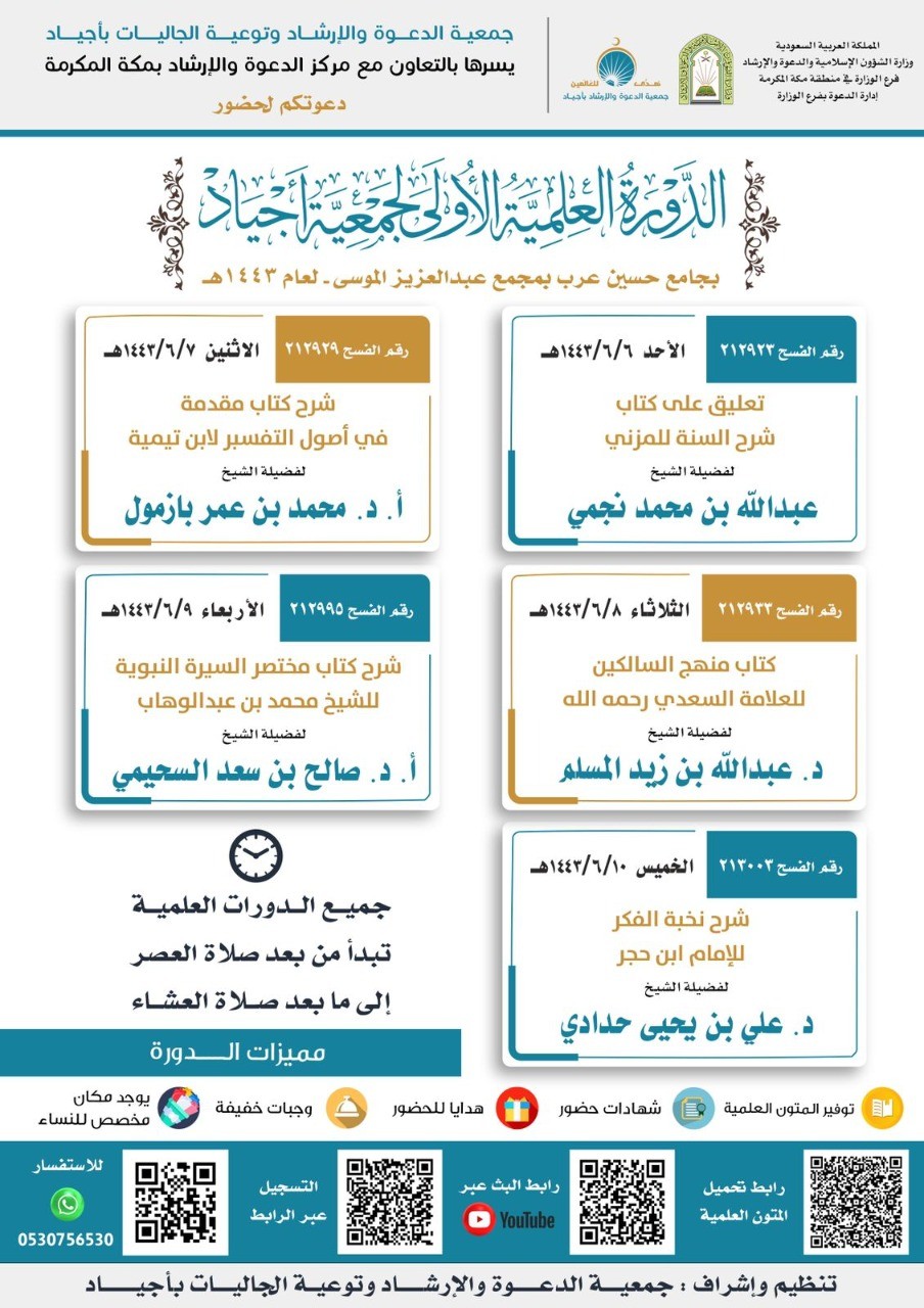 تنظم جمعية الدعوة والإرشاد وتوعية الجاليات بأجياد في مكة المكرمة برنامج "الدورة العلمية الأولى", بإشراف فرع وزارة الشؤون الإسلامية والدعوة والإرشاد بمنطقة مكة المكرمة, ويشارك في تقديمها نخبة من الدعاة والمشايخ الرسميين بالوزارة خلال الفترة: 6 جمادى الآخرة وتستمر خمسة أيام وتقام في جامع حسين عرب بمجمع الموسى الواقع بحي الهجرة في مكة.