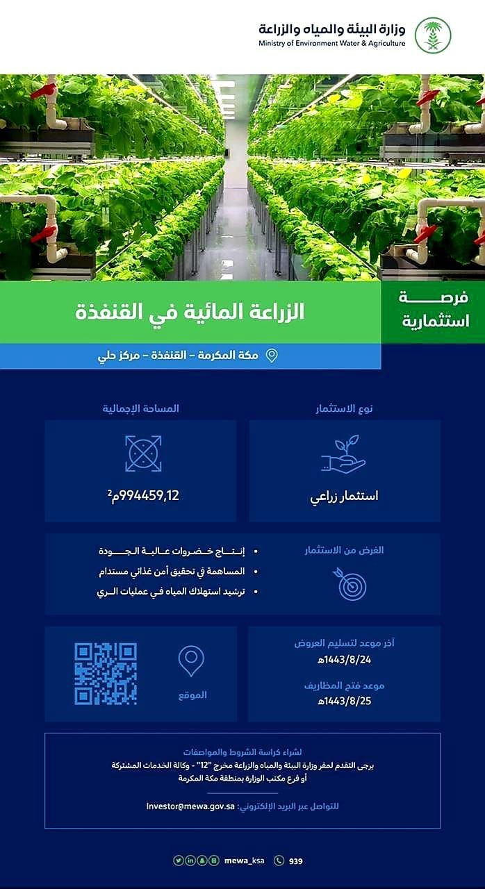 طرح فرص استثمارية لإنشاء مشاريع للزراعة المائية في محافظة القنفذه