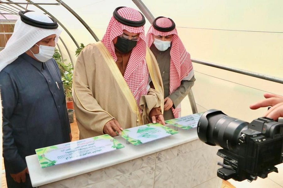 ثم تجول سموه في أقسام المشروع والذي يضم المعرض البيئي وهو عبارة عن صالة عرض إفتراضية يتوفر فيها شاشات علمية مزودة بتقنية الواقع الإفتراضي والتي تناقش المشاكل البيئية وما تقدمه القيادة الرشيدة من جهود لحماية البيئة، بالإضافة إلى بيت محمي لزراعة الشتلات وحمايتها بمساحة 9*25 على مساحة أرض 25*25 لزراعة النباتات الصحراوية المهددة بالانقراض والمتناسبة مع بيئة المحافظة، ومستودع للأدوات الزراعية