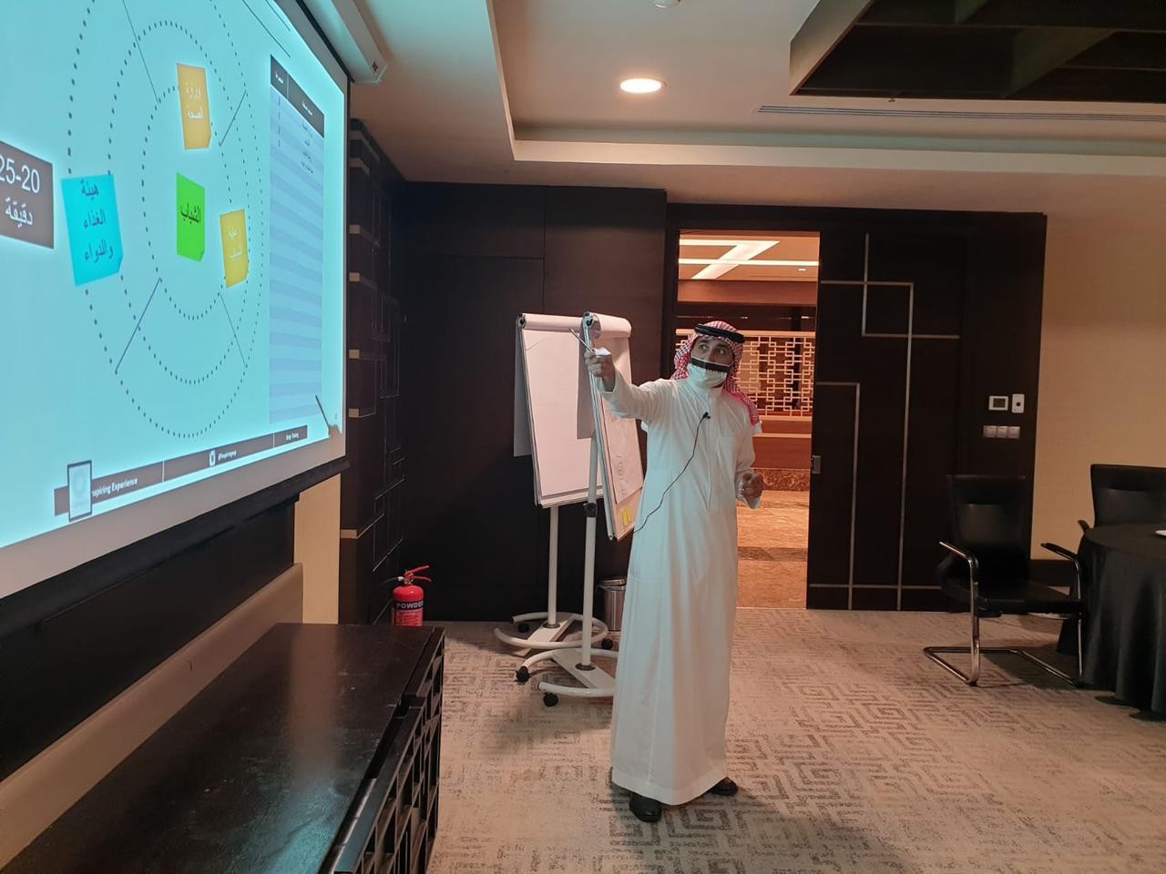 استهدفت الورشة 56 متدربا ومتدربة على مدار يومين جرى خلالها التعرف على التفكير التصميمي ومراحله في تنفيذ الأفكار والمبادرات والمشاريع تلاه صياغة التحدي التصميمي والتعرف على خريطة رحلة المستفيد مع تحليل الفرص وتوليد الأفكار الإبداعية المبتكرة وإعداد النموذج الأولي؛ حيث تم توزيع المتدربين مجموعات للتطبيق العملي وذلك من باب مايتطلبه التفكير التصميمي من التنوع وتبادل الخبرات وتشجيع الأفكار التلقائية وتقبل المختلفة الأدوات واستثمار الموارد والتكنولوجيا مع جمع المعلومات الملاحظة والتغيير. وقد لاقت الورشة تفاعلًا من المتدربين والمتدربات، مستعرضين أفكارهم واستفسارتهم ومخرجاتهم التطبيقية التي تم عرضها بعد انتهاء كل محور.