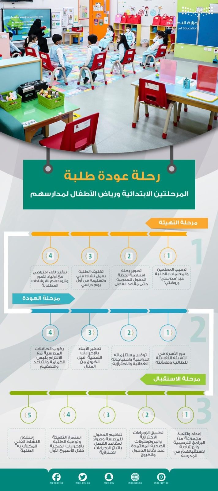 وتبدأ رحلة عودة الطلاب والطالبات إلى مدارسهم بتطبيق برنامج التهيئة للعودة الحضورية الذي بدأ بترحيب المعلمين والمعلمات بطلابهم عبر منصتي “مدرستي” و”روضتي”، ومحاكاة أول يوم دراسي من خلال تصوير رحلة افتراضية من لحظة دخول الطلبة للمدرسة حتى وصولهم إلى مقاعد الفصل الدراسي.