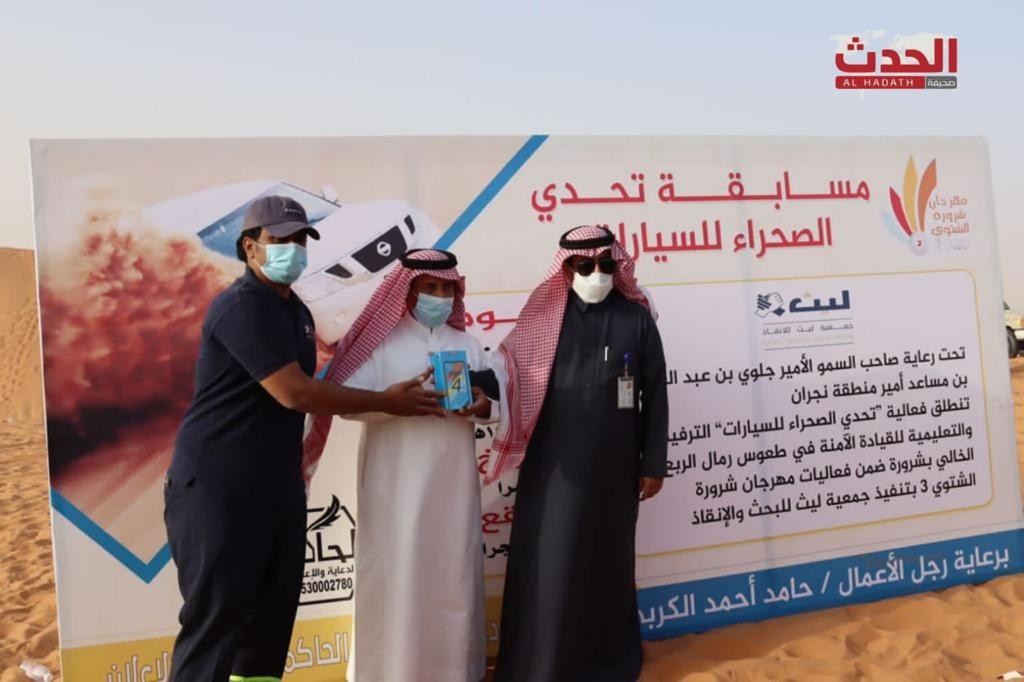 أُختتمت فعاليات سباق " تحدي الصحراء للسيارات " عصر اليوم بمحافظة شرورة ، وذلك للمرة الثالثة ضمن فعاليات مهرجان شرورة الشتوي الثالث برعاية كريمة من صاحب السمو الامير جلوي بن عبدالعزيز بن مساعد أمير منطقة نجران - حفظه الله - وبإشراف مباشر من سعادة محافظ شرورة المكلف موفق بن عبد الهادي العنزي وبدعم من رجل الأعمال حامد أحمد الكربي .