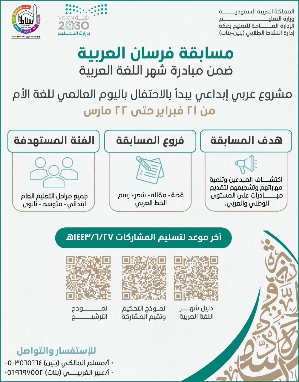 أطلقت الإدارة العامة للتعليم بمنطقة مكة المكرمة ممثلة في إدارة النشاط الطلابي مسابقة فرسان العربية التابعة لمبادرة شهر العربية اليوم الأربعاء الموافق 1443/6/23هـ، نفذتها مشرفي ومشرفات النشاط الثقافي متمثلة في المشرف التربوي مسلم المالكي والمشرفة التربوية عبير الغريبي وذلك بمساندة إدارة الإشراف التربوي تحت إشراف مديرة الإدارة د.ليلى الصاعدي .