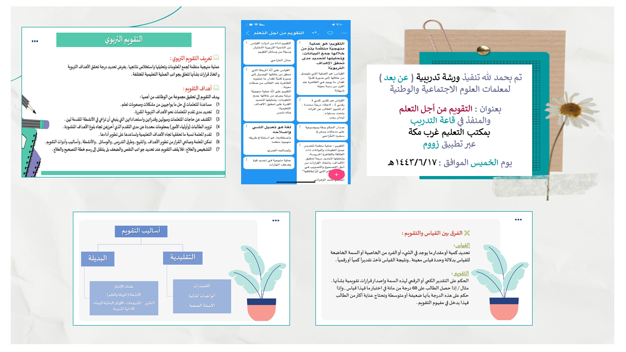 نفذ مكتب التعليم غرب مكة -شعبة العلوم الاجتماعية والتربية الوطنية- بالإدارة العامة للتعليم بمنطقة مكة المكرمة يوم الخميس 17/6/1443هـ ورشة تدريبية بعنوان: التقويم من أجل التعلم بمركز التدريب بمكتب التعليم عبر تطبيق الزووم.