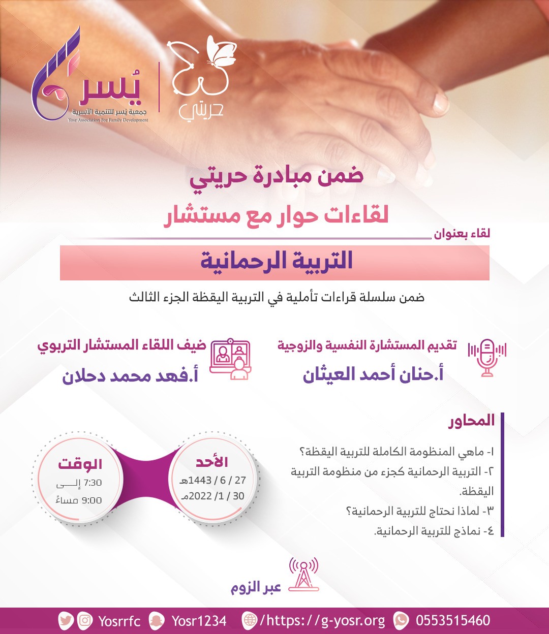 ضمن الفعاليات والأنشطة والبرامج الثقافية التي تنظمها جمعية يُسر للتنمية الأسريَّة ممثلةً في إدارة الاستشارات الأسريَّة يقام لقاء بعنوان"التربية الرحمانية"وذلك ضمن سلسلة حوار مع مستشار (التربية اليقظة).