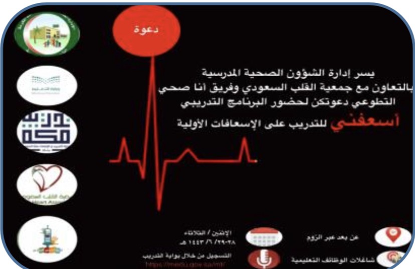 نفذت الإدارة العامة للتعليم بمنطقة مكة المكرمة ممثلة في إدارة الشؤون الصحية المدرسية بمساندة فريق أنا صحي التطوعي وجمعية القلب السعودي بمكة المكرمة برنامجاً تدريبياً للتدريب على الإسعافات الأولية، بعنوان (اسعفني)، وذلك يومي الاثنين والثلاثاء الموافق 28 – 29 / 6 / 1443هـ، والمنفذ بالقاعة الافتراضية بمركز التدريب الخامس بالشرائع بإدارة التدريب والابتعاث من قبل المنفذات هند الغامدي ونجوى المقاطي مشرفات الشؤون الصحية المدرسية و فريق أنا صحي التطوعي وجمعية القلب السعودي بمكة، بمتابعة من مساعدة مدير إدارة الشؤون الصحية المدرسية رضية الخطابي، والتي ألقت فيه كلمتها التي أوضحت فيها تعريف الإسعافات الأولية وضرورة التدرب عليها، وأهمية توفر الحقيبة الإسعافية، ومن ثم قامت بشكر الحاضرات والمنفذات للبرنامج، حيث استهدف البرنامج جميع منسوبات إدارة التعليم ومكاتب التعليم والمدارس، لتدريب الكادر التعليمي والإداري على الإسعافات الأولية لمواجهة الحالات الطارئة حفظ الله الجميع .