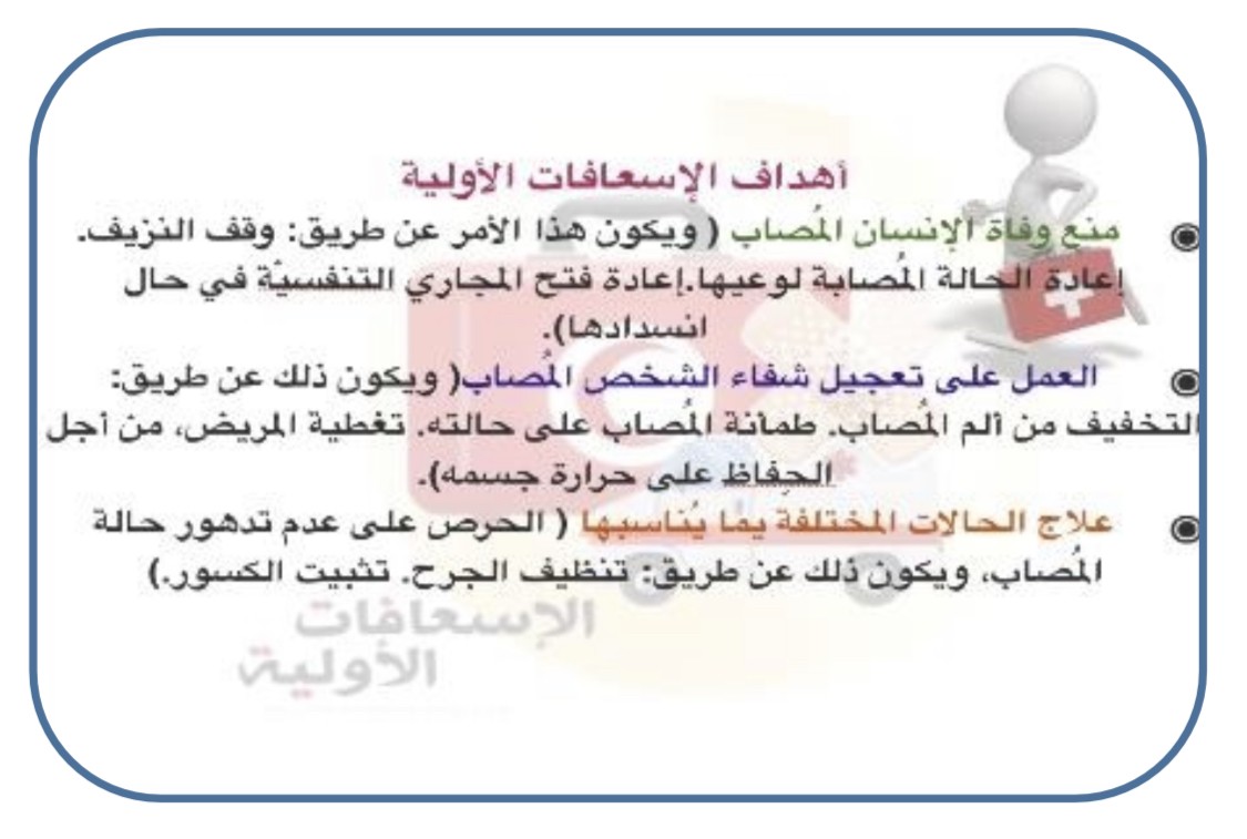 تناول البرنامج تعريف معنى الإسعافات الأولية وأنواعها من حيث الإسعاف الأولي، الإسعاف الطبي، المسعف الأولي، المسؤول عن تقديم الإسعافات الأولية، صفات المسعف، المبادئ العامة للإسعافات الأولية وممارساته، توضيح القواعد الأساسية في الإسعاف الأولي، ومن ثم تم استعراض بعض الإصابات وطرق إسعافها، وشرح الحقيبة الإسعافية ومكوناتها وأهميتها، وتصحيح بعض العادات الإسعافية الخاطئة، التعرف على أهم الإصابات وطرق إسعافها، وعرض مقاطع فيديوهات توعوية عن أهمية الإسعافات الأولية .