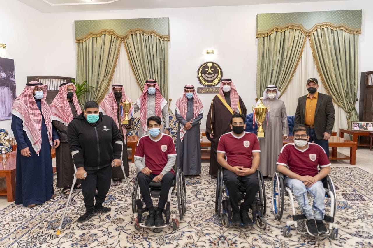 جاء ذلك خلال استقبال سموه في مكتبه اليوم، لرئيس مجلس إدارة نادي الجوف لذوي الإعاقة فهيد بن عشوي الشمري، والرئيس التنفيذي للنادي صالح بن مصلح المريح، ومدرب الفريق مهند جبار، و13 لاعباً بمناسبة حصول فريق كرة الهدف لذوي الإعاقة البصرية، وفريق كرة السلة على الكراسي المتحركة على كأس دوري الدرجة الأولى، والتأهل إلى الدوري الممتاز.