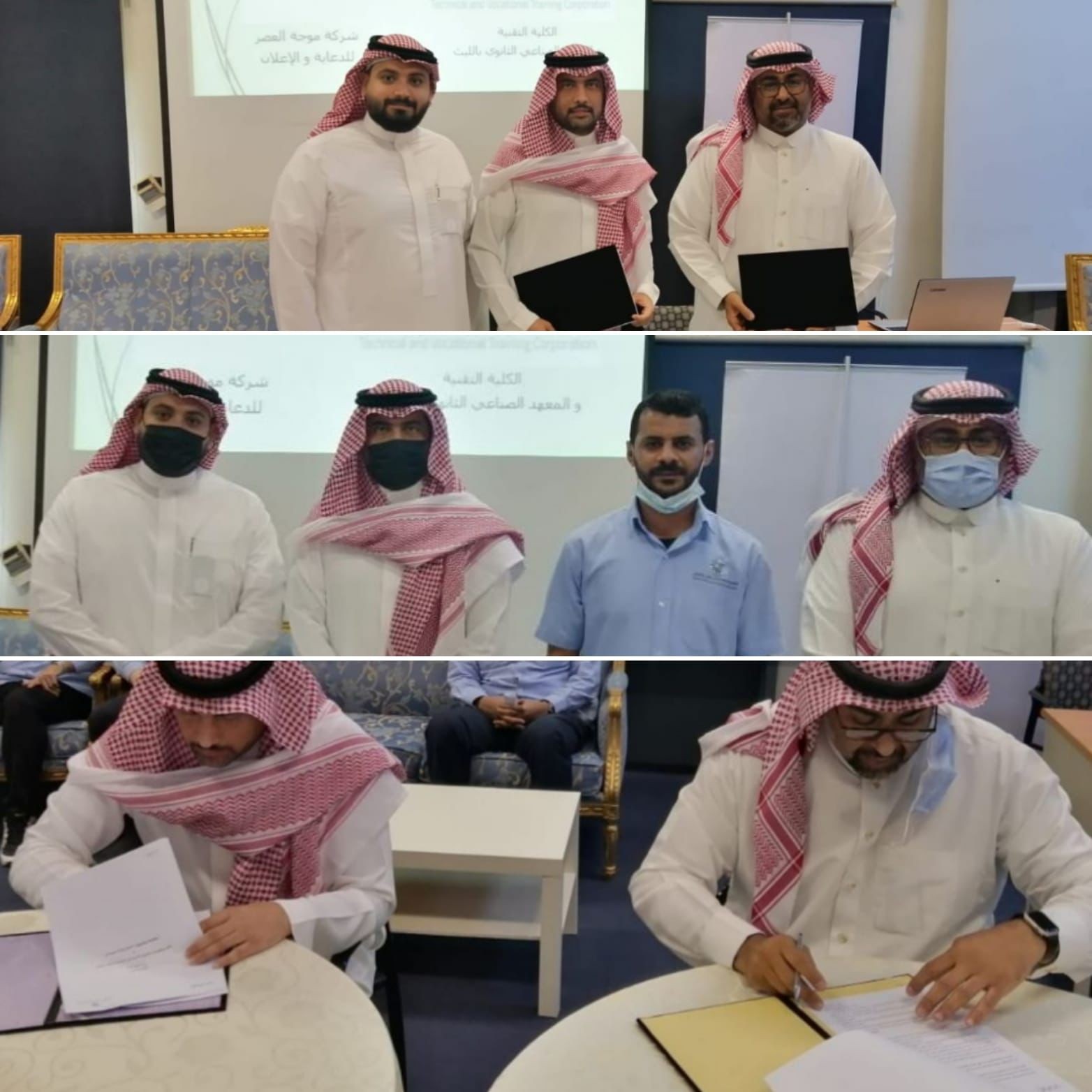 وقع سعادة عميد الكلية التقنية بالليث المهندس/عيسى مسفر العسيري ورئيس وحدة التنسيق الوظيفي المهندس/محمد عبدالله الحداد مذكرة تفاهم للتوظيف المباشر مع شركة(Wave Media) للدعاية والإعلان ممثلةً بنائب المدير التنفيذي للموارد البشرية و الخدمات المشتركة أ.فهد بن عبدالعزيز السواجي.