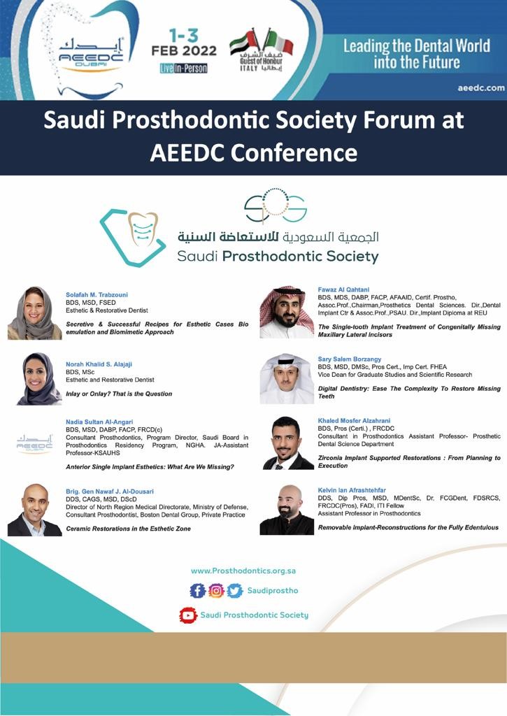 بعد النجاح الذي حققته الجمعية السعودية للاستعاضة السنية في مؤتمرها السعودي العالمي للاستعاضة السنية والذي عقد افتراضياً على مدار ٣ أيام في أواخر شهر اكتوبر 2021 وذلك بمشاركة ٢٨ متحدث دولي ومحلي ، تُشارك الجمعية السعودية للاستعاضة السنية بيوم علمي كامل في المؤتمر العالمي لطب الأسنان إيديك دبي 2022 والذي ينطلق في دورته السادسة والعشرون وذلك من ١-٣ فبراير 2022 ، والجدير بالذكر بأن هذه المشاركه تعد كأول جمعية سعودية خليجية تشارك بيوم علمي متكامل وبمتحدثين ممثلين لها في هذا الحدث العلمي الكبير.