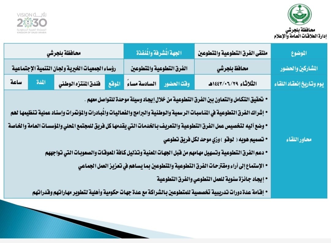وتم خلال اللقاء مناقشة العديد من الموضوعات التي تخص الجانب التطوعي والتعاون والتكامل بين جميع الفرق التطوعية ، والمجتمع المحلي والجهات الحكومية والمؤسسات الأهلية بالمحافظة وتقديم الدعم والمساندة لهم .